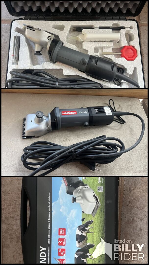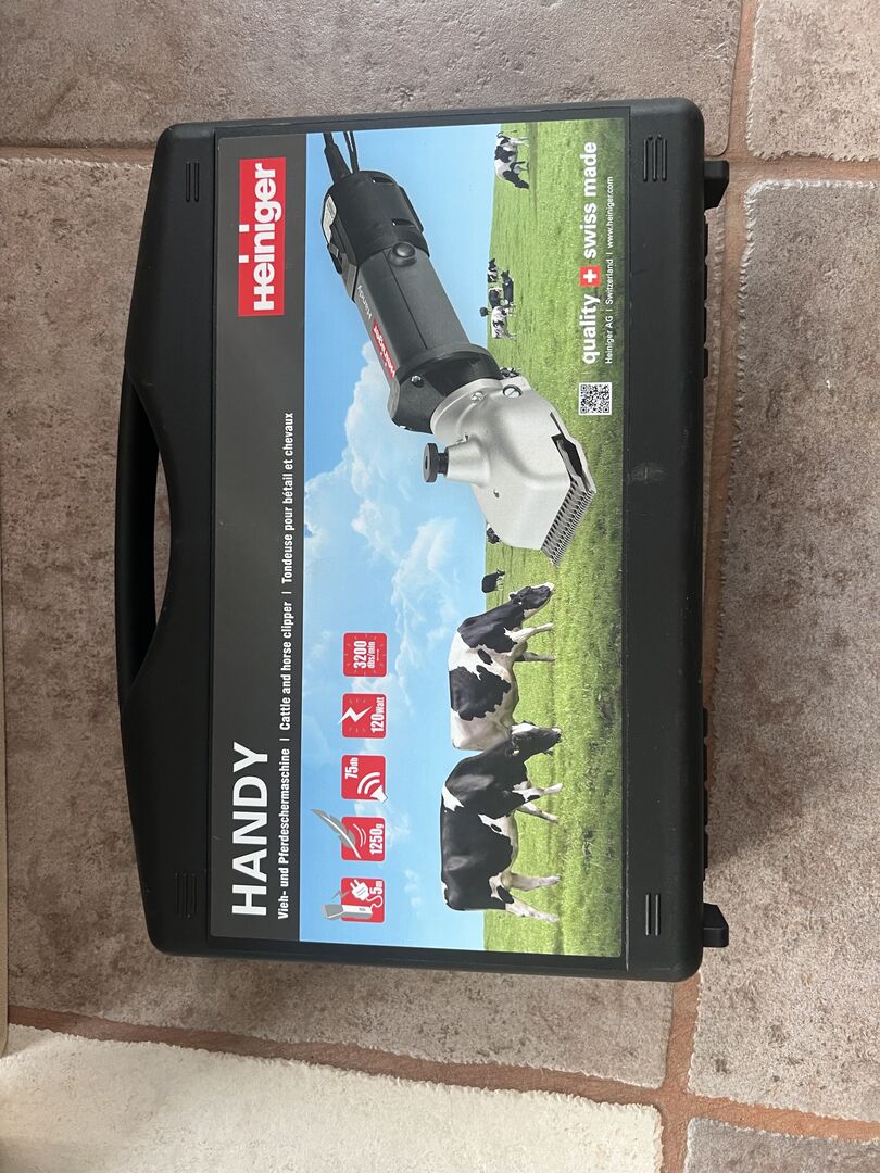 Heiniger Handy Pferdeschermaschine (kabelgebunden). Etwa 8 Mal benutzt. Funktioniert einwandfrei - alles funktioniert wie es soll. Verkauft, da nicht mehr benutzt. Inklusive Originalklingen und Netzkabel.