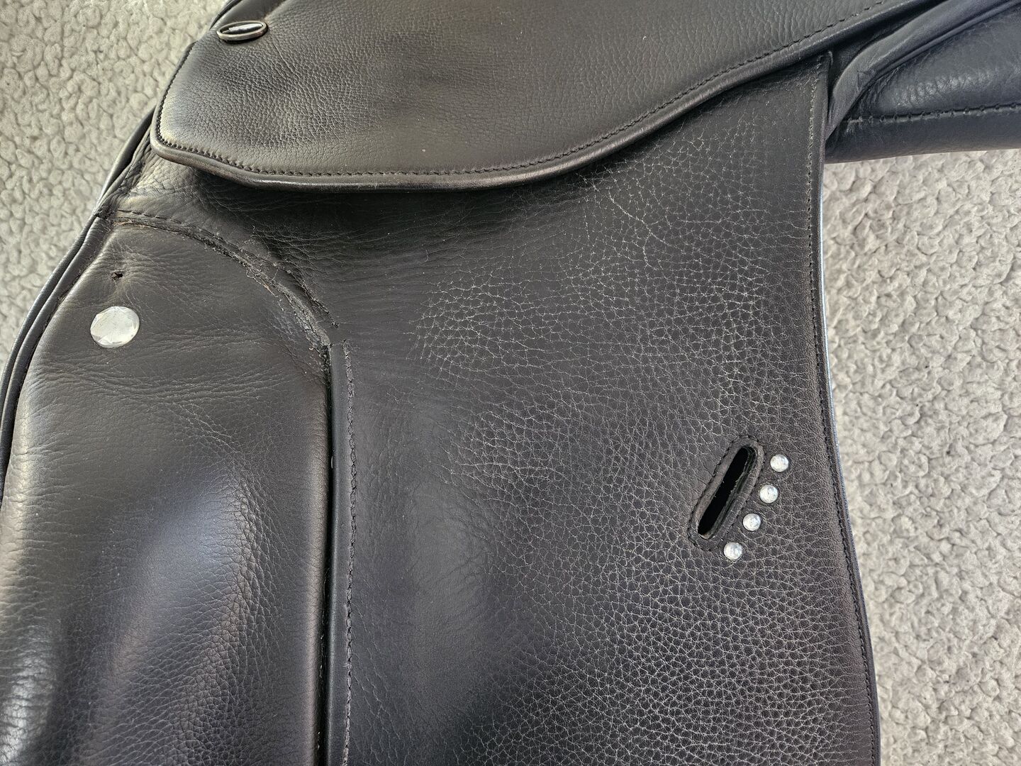 Durch die vorderen Pauschen hat man einen guten Halt. Er wurde regelmäßig gepflegt und befindet sich in einem guten, altersgemäßen Zustand. Zur optischen Verschönerung habe ich im Bereich der Steigbügelriemenlöcher und an der Pausche Glitzersteinchen angebracht. Diese halten auch gut, ich würde auch noch ein paar passende dazu geben.