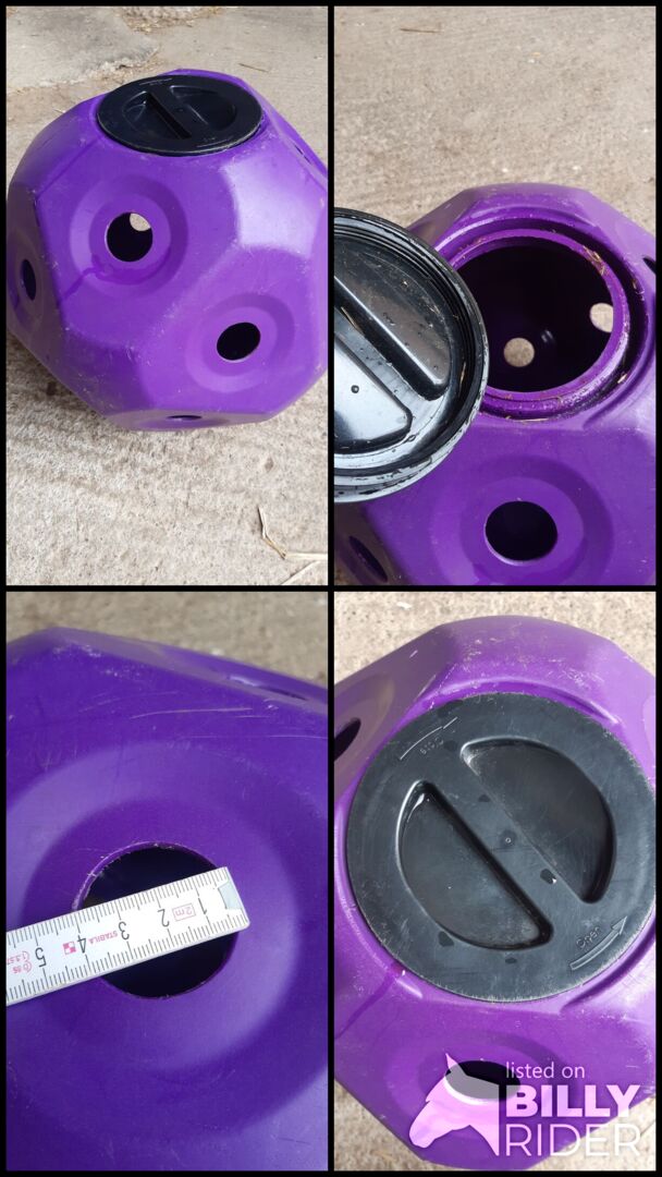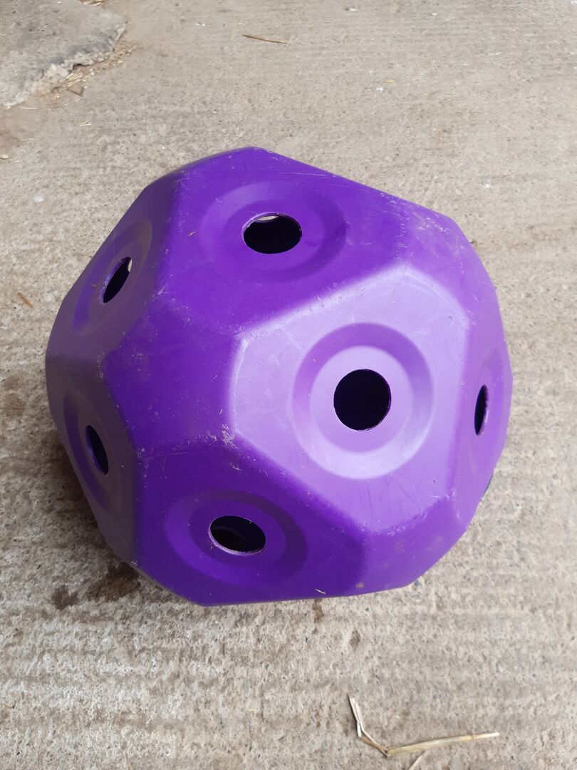 Infos laut Hersteller: Der Futterspielball in lila ist für die Verwendung im Stall, auf der Weide oder Paddock bestens geeignet und fördert spielend die langsame und tiergerechte Raufutteraufnahme.