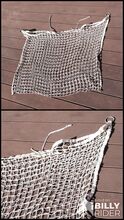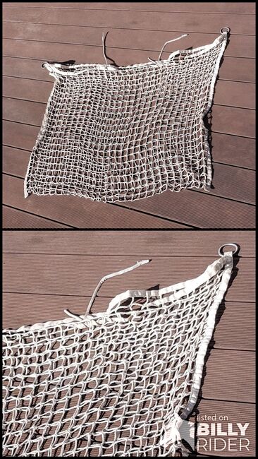 Heunetz 120x90cm Heunetz mit besonders enger Maschenweite von 3 x 3 cm lässt Pferde ruhig und entspannt fressen. An beiden oberen Enden mit Ringen zum aufhängen. Kann einfach und ausreichend befüllt werden. Prima für Pferde bei Boxenruhe. Keine Beschädigungen.