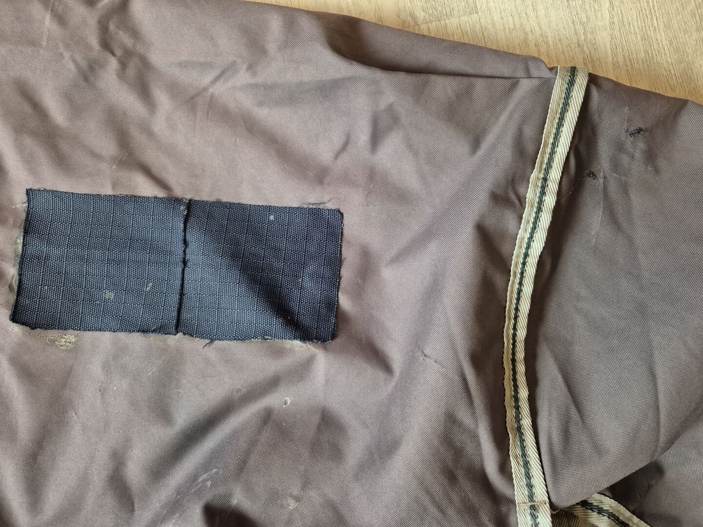 Die Decke ist dicht, das Innenfutter ist unbeschädigt, die Füllung noch an ihrem Platz. Ein paar Knibbelspuren im Außenstoff sowie zwei professionell geflickte Stellen (s. Fotos). Alles dicht.