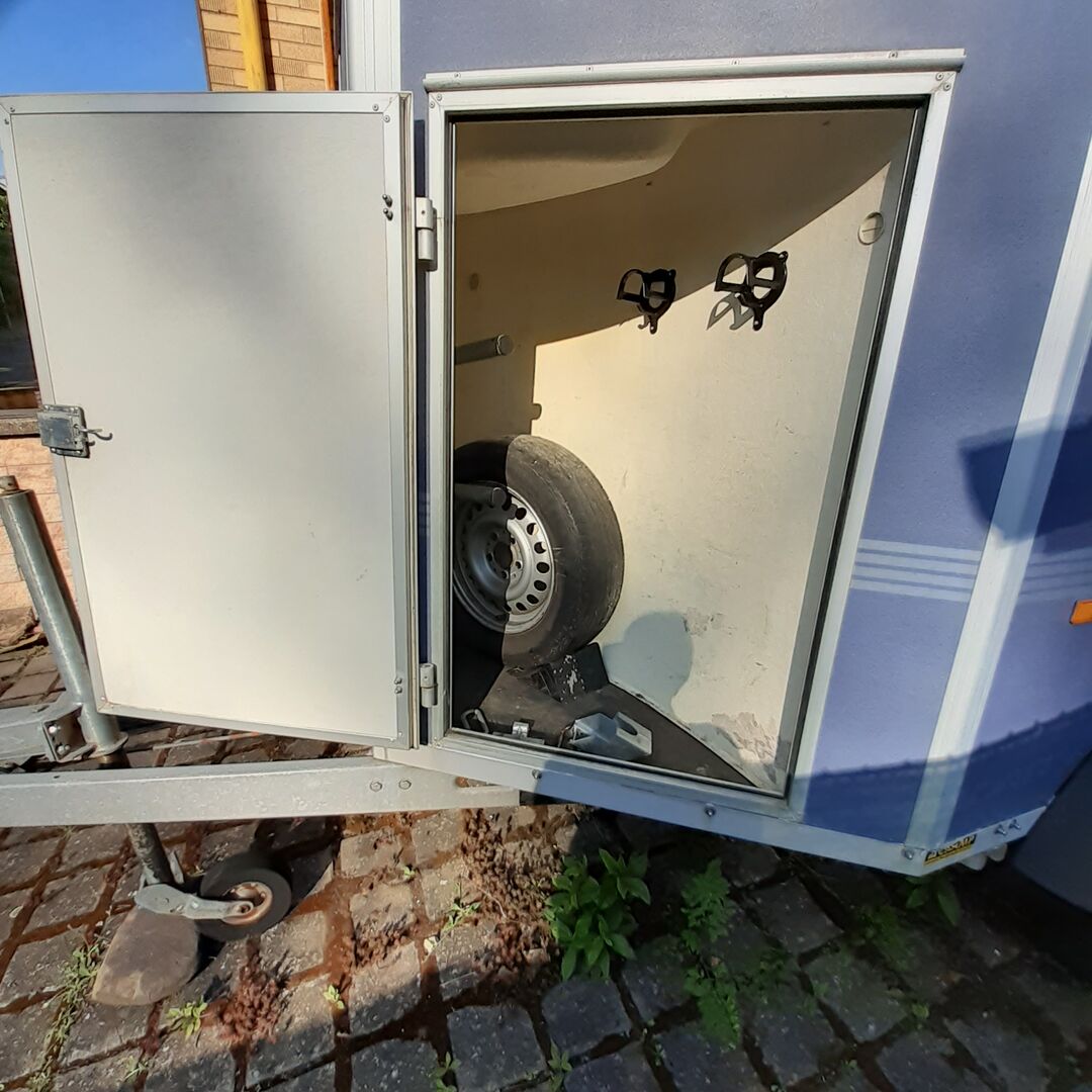 Gebrauchter Pferdetransporter, TÜV bis 7/25, der Pferdetransporter ist in einem altersgemäß sehr gutem Zustand, normale Gebrauchsspuren, die Wand, sowie der Boden bei der Tür müssen an 2 kleinen mittelgroßen Stellen ausgebessert werden. Ich habe den Hänger seit 4 Jahren nur noch zum Transport von Möbeln, Holz und Gartenabfällen genutzt.