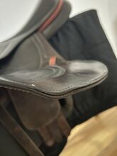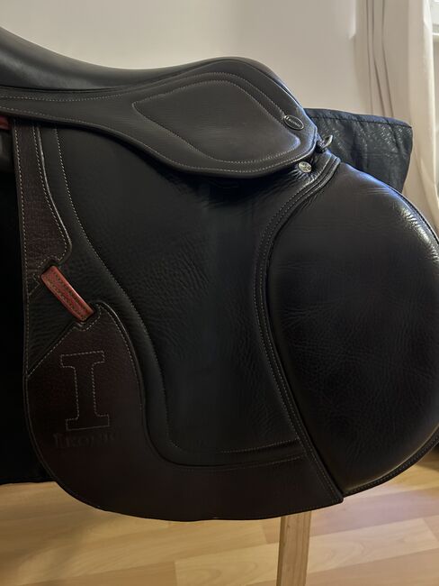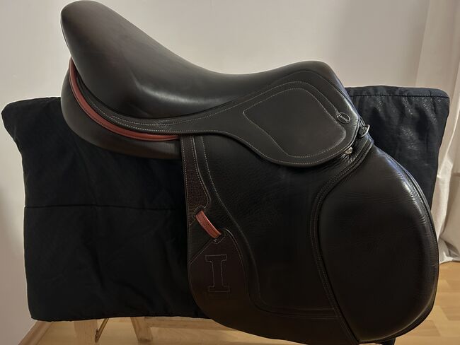 Der Sattel ist aus hochwertigem braunen Leder gefertigt und hat schöne rote Akzente. Er eignet sich perfekt für das Springreiten und bietet sowohl Reiter als auch Pferd optimalen Komfort.