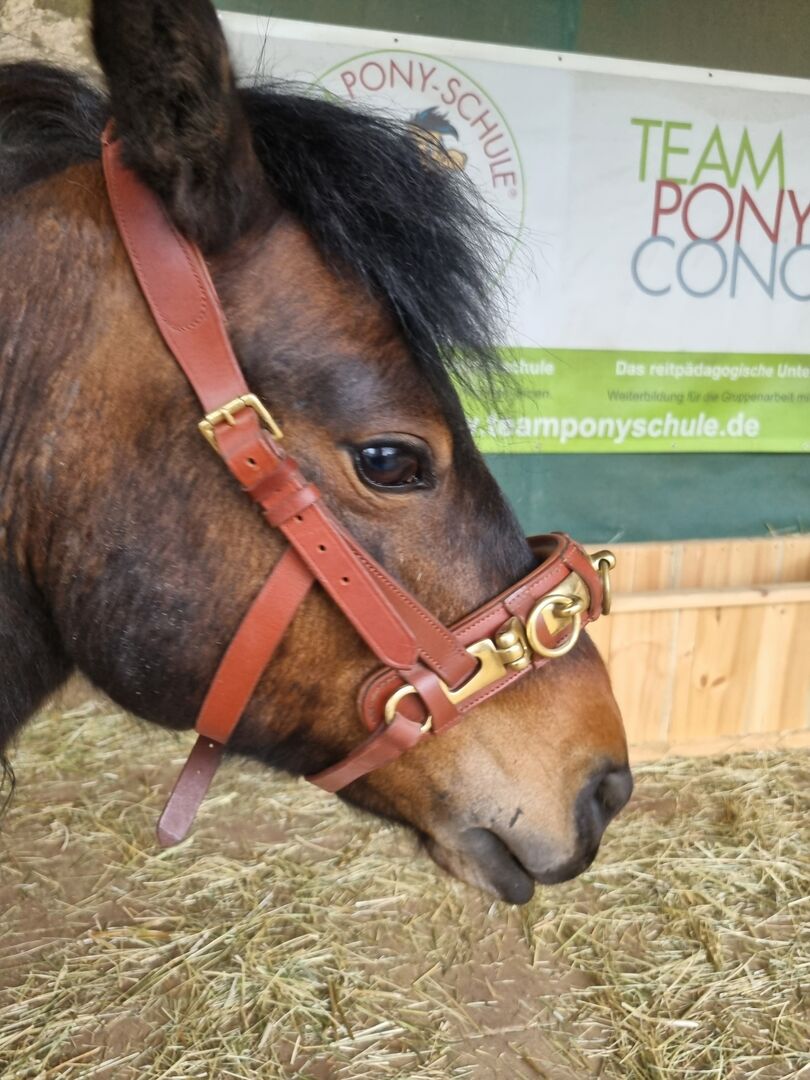 Kappzaum mit dreiteiligen Naseneisen in Gold. Er wurde kaum gebraucht und ist in sehr gutem Zustand. Größe ist Pony/Vollblut.