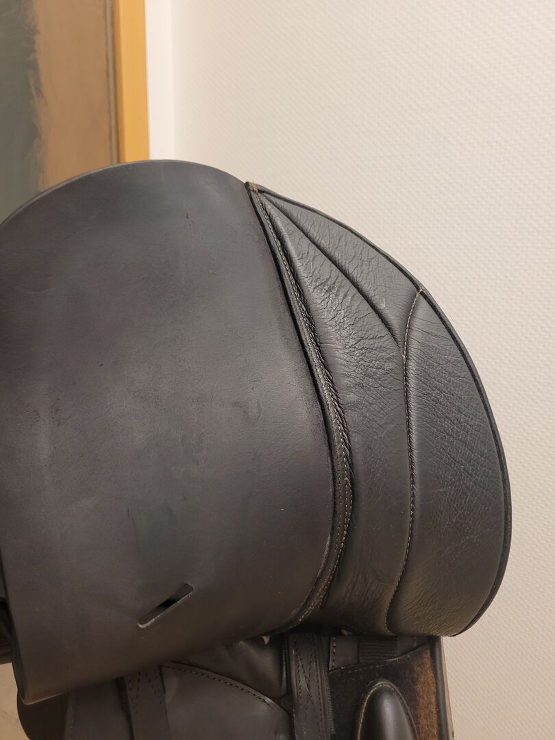 Die einzigen Macken die nicht vom normalen Gebrauch kommen ( Spuren von den Steigbügelriemen oder den Stiefeln zum Beispiel), sind oben auf dem Kranz des Sattels, dort befinden sich leichtere Kratzer. Siehe Fotos.