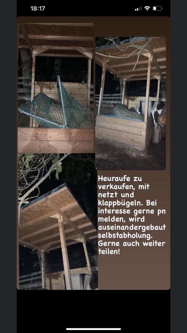 Biete selbstgebaute hochwertige Heuraufe mit Klappbügel und Heunetz an. ( Neupreis 2500€) Maßanfertigung. Hochklappen, rein rollen , Runterklappen und Fertig. Kein Heuverlust da die raufe schön groß ist. Hatten 1,60 cm Ballen drin und es war noch genug Platz. Für große Pferde gebaut ( Pferd mit 180cm ) so das keine Verletzungsgefahr besteht. Sie ist abgebaut und zum Transport fertig.Heuraufe ist in 76829 Ranschbach abzuholen.