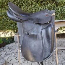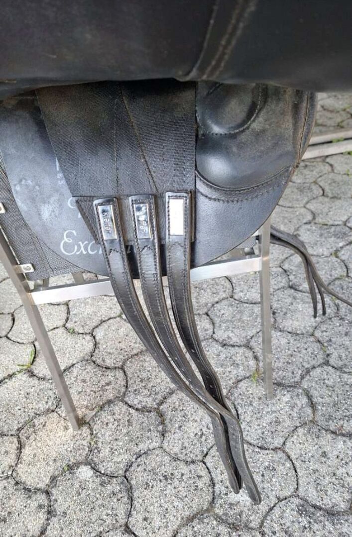 × Monoblatt-Dressursattel ×Flacher Sitz × Kniepauschen auf dem Sattelblatt ×Verkürztes Kissen im Schulterbereich (Tulpenform) × Stark verkürztes Schweißblatt Sitzgröße: 1 Kammerweite: 32