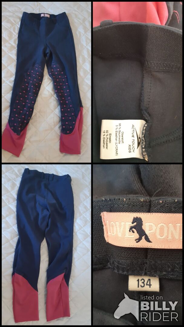Dunkelblaue Stoffreithose, abgesetzte pinke Elemente, keine Taschen, Gürtelschlaufen, Gr. 134