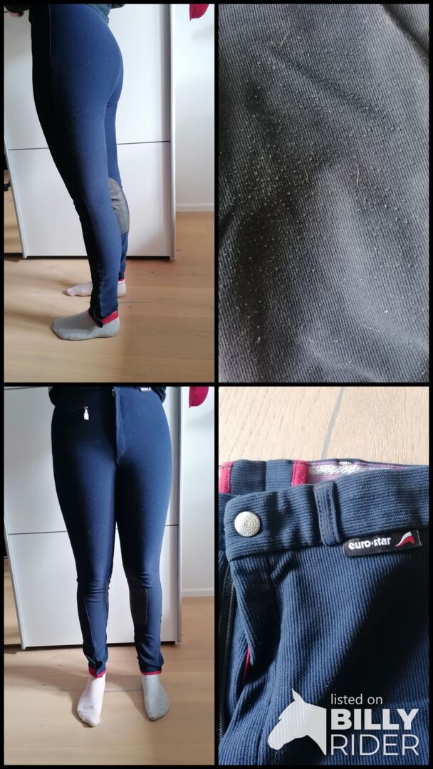 Dunkelblaue Kinderreithose in Größe 176. Wie man auf den Bildern sieht, mit ein paar Gebrauchsspuren, aber immer noch in gutem Zustand.