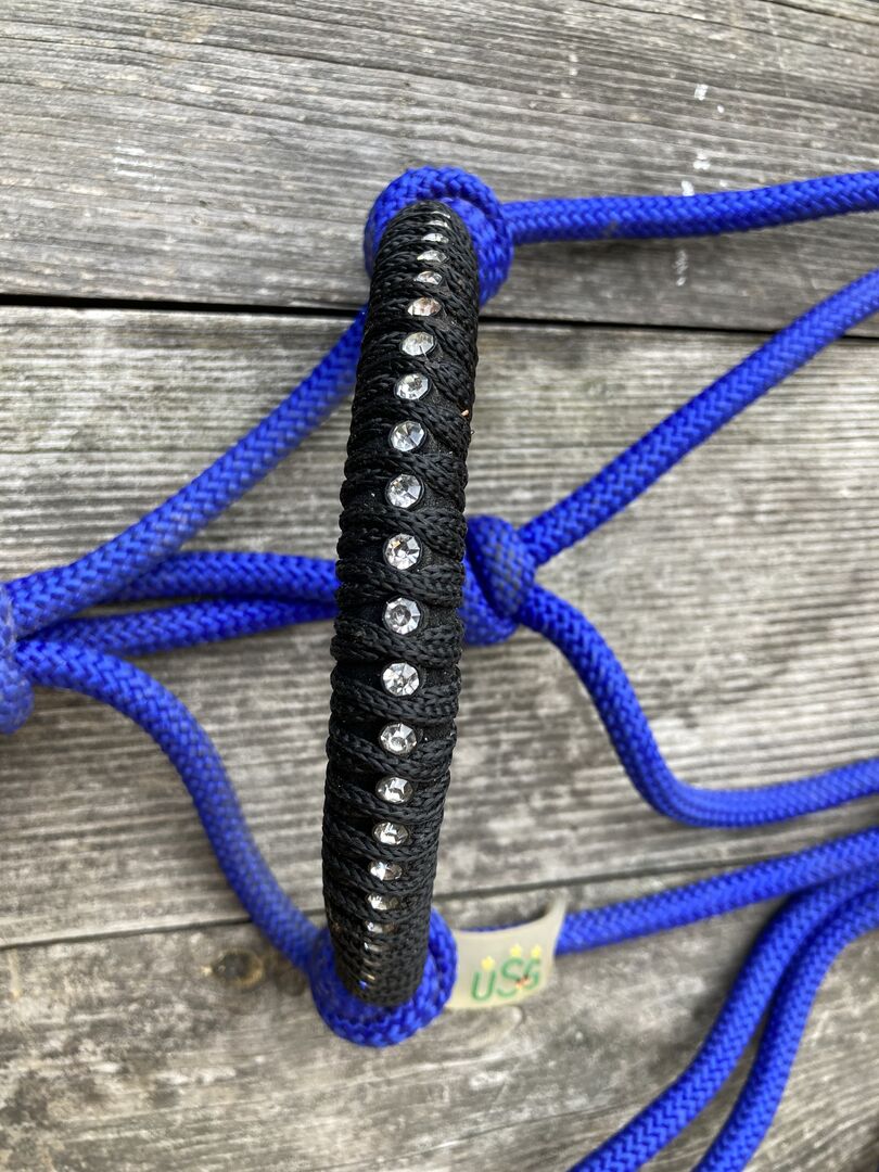 Knotenhalfter zweifarbig mit Glitzersteinen am Nasenriemen. Neuwertiger Zustand, 3x benutzt, verstellbare Knoten.