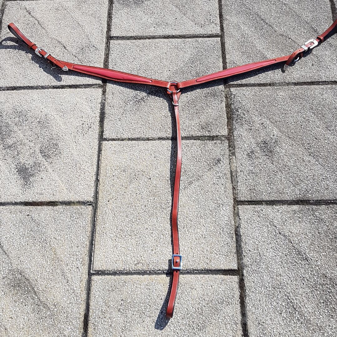 Biete hier eine selten benutzte Western Kombi an, bestehend aus Trense, Zügel, Vorderzeug! Alles aufeinander abgestimmt. Gute Lederqualität, noch etwas steif, da praktisch neu! Würde mir zu Weihnachten geschenkt, ich werd aber trotz probetragen (Pferd! ) nicht warm damit.... Schöne rote Lederinlays, Zierschnallen, Größe Warmblut. Natürlich größenverstellbar.