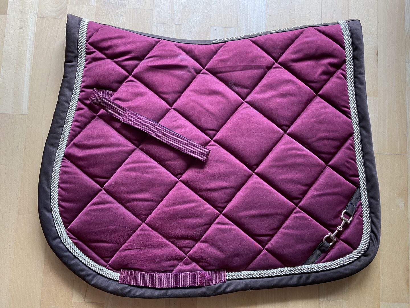 Die Schabracke ist in einem schönen Dunkelrot mit leichtem Lilaton und in schöner Rautensteppung. Die Oberfläche ist glänzend und aus glattem, leicht zu reinigendem Gewebe. Die umlaufende Kordel ist in einem dezenten Beige gehalten, der Rand in einem tiefen Dunkelbraun.
