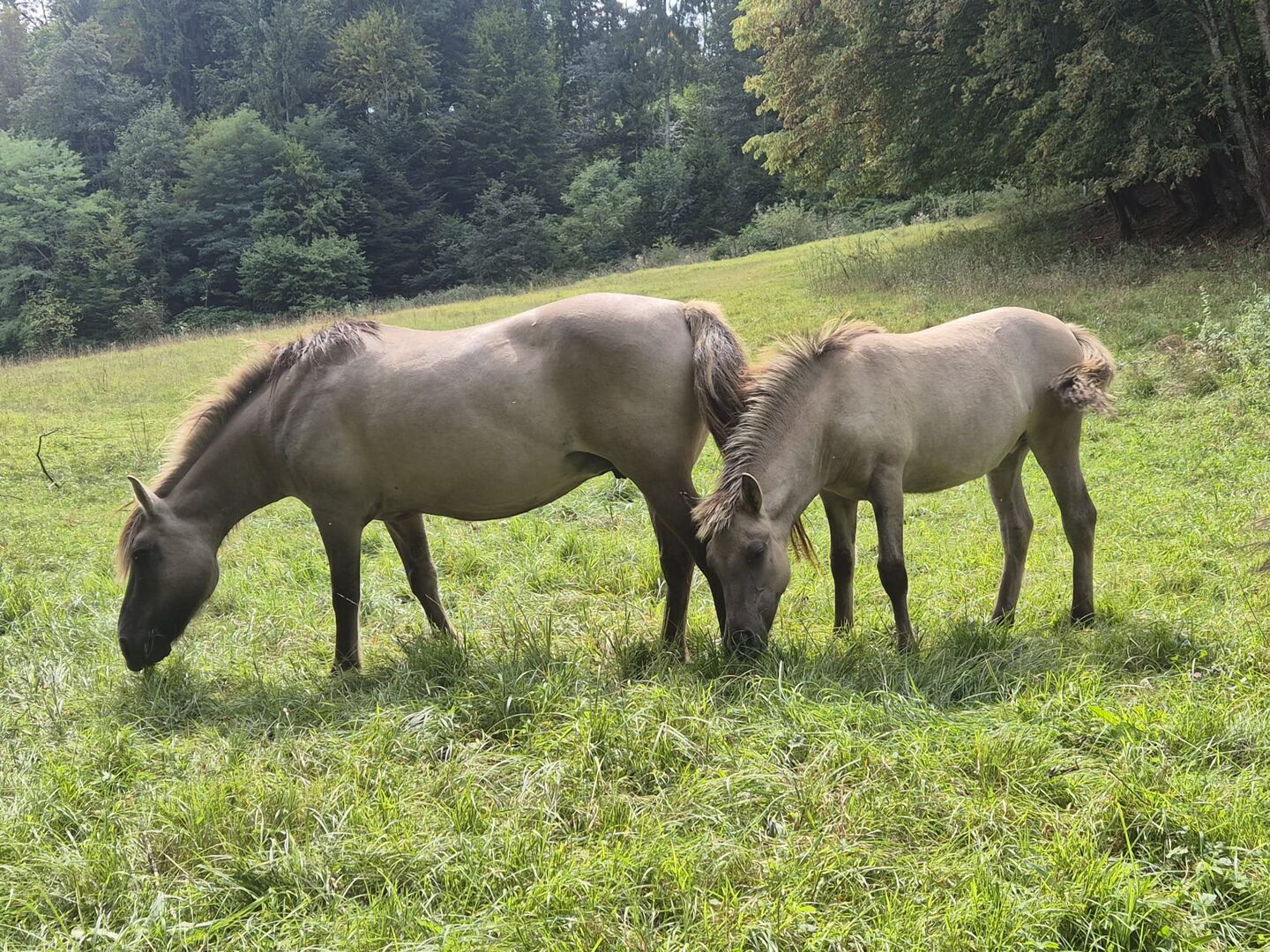 Zum Verkauf kommt Milli, eine Liebenthaler Stute mit typischer Wildpferdzeichnung. Milli ist am 30.3.25 geboren. Sie wächst in der Herde und Freilandhaltung sehr artgerecht auf kräuterreichen Hangweiden auf. Sie ist mutig und trotzdem relaxt (habe ihr die Hufe schon mit Flex bearbeitet). Sie wird ein Pony, das mit seinem Lieblingsmenschen durch dick und dünn geht. Sicherlich mal sehr gut einsetzbar als Therapiepferd, für Wanderritte oder Reiterspiele. Wird schätzungsweise 1,42 ca. Nur in Pferdegesellschaft und an Käufer mit Jungpferderfahrung oder Zusicherung auf Ausbildungsplatz. Jungpferde gehören nicht in Kinder- oder Laienhände! Mehr und neuere Bilder und Videos auf Anfrage. In den Bildern das Portrait ist ihr Vater, die Bilder sind vom letzten Sommer und Herbst, das erste von Dezember.