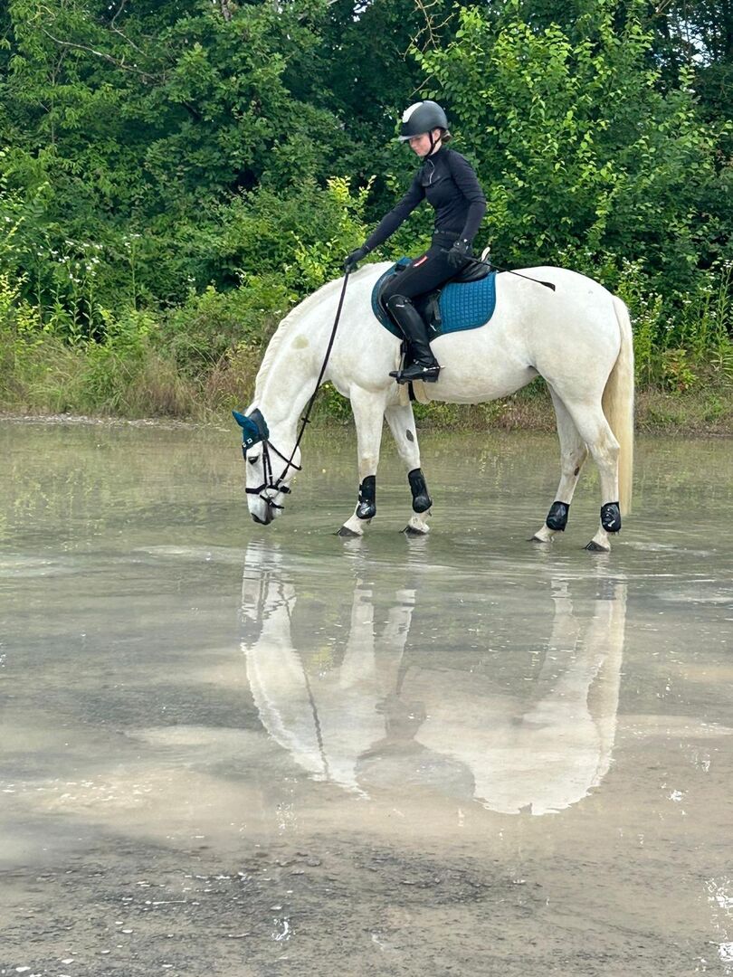 Auch außerhalb der Turnieratmosphäre ist sie für jeden Spaß zu haben. Ob mit Halsring reiten, ohne Sattel reiten oder stundenlange Ausritte (alleine), May macht alles mit Spaß an der Arbeit mit.