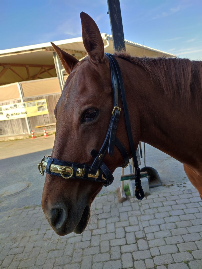 Gebrauchte Lederkappzaum mit Gebissriemen. Sehr guter Zustand, keine Macken. Größe WB