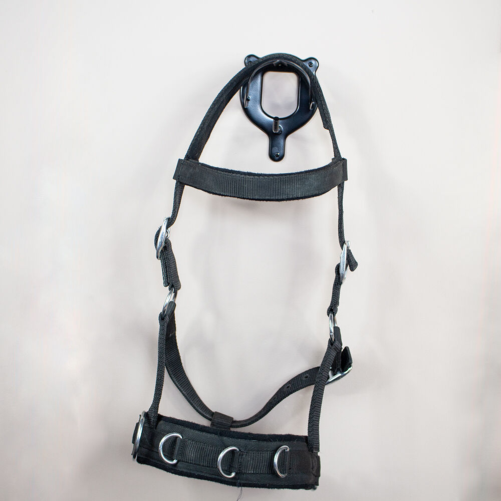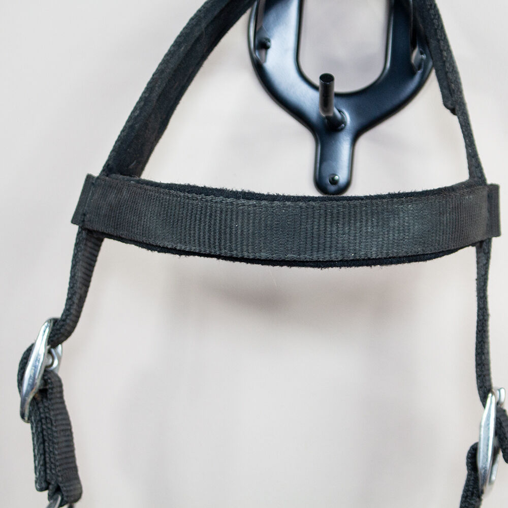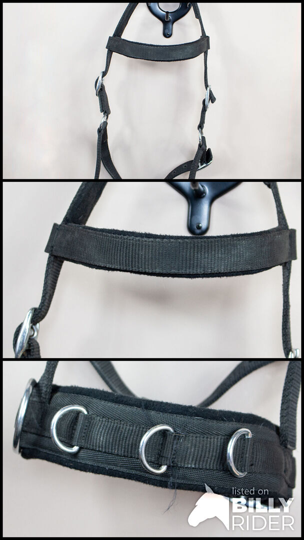 Das praktische schwarze Longierhalfter ist der perfekte Begleiter im Alltag. Es eignet sich perfekt zum Longieren. Das Halfter ist verstellbar am Genick und Nasenriemen und passt dadurch auf viele verschiedene Pferde und Ponys. Es hat Größe Cob. Es ist weich unterlegt. Das Halfter weist generelle Gebrauchsspuren auf und hat leichte Verfärbungen.