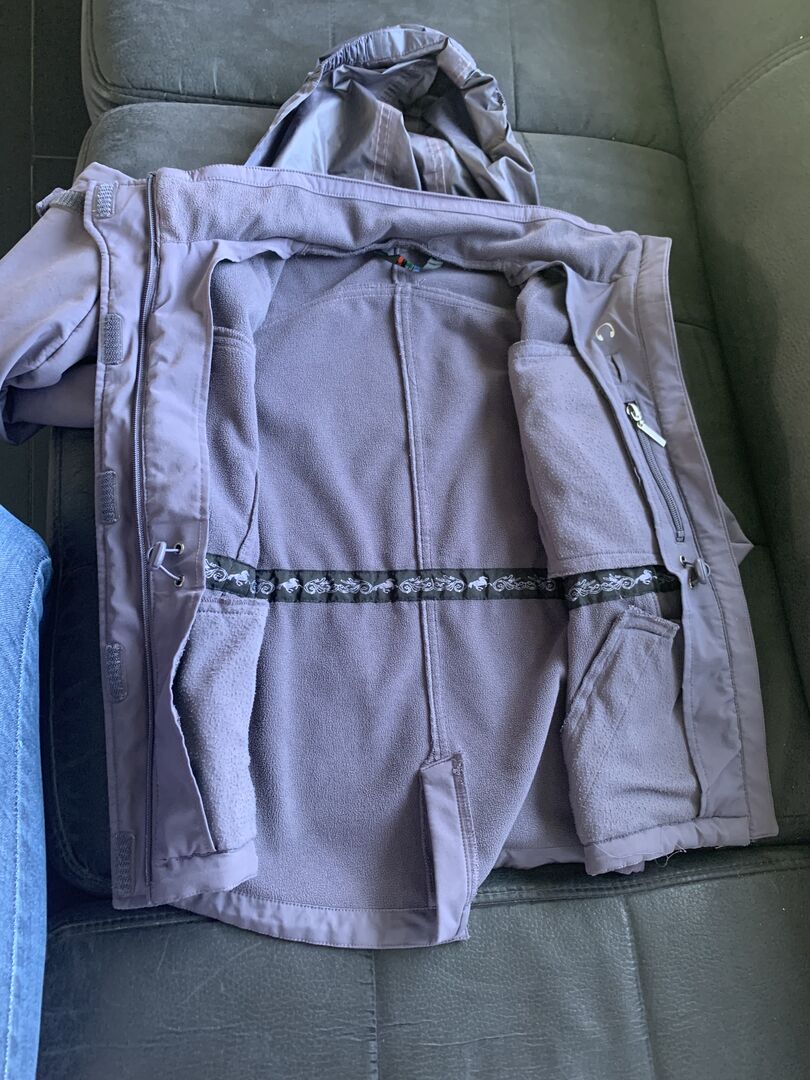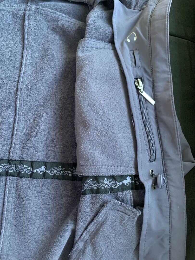 Sehr gut erhaltene softshell Jacke ideal für kleine Reit Freunde. In der Taille verstellbar mit Sicherheitstasche an der Innenseite und zwei Außen Taschen. Im Kragen eine Kapuze. Keine Flecken, Löcher, Risse. Nichtraucherhaushalt.