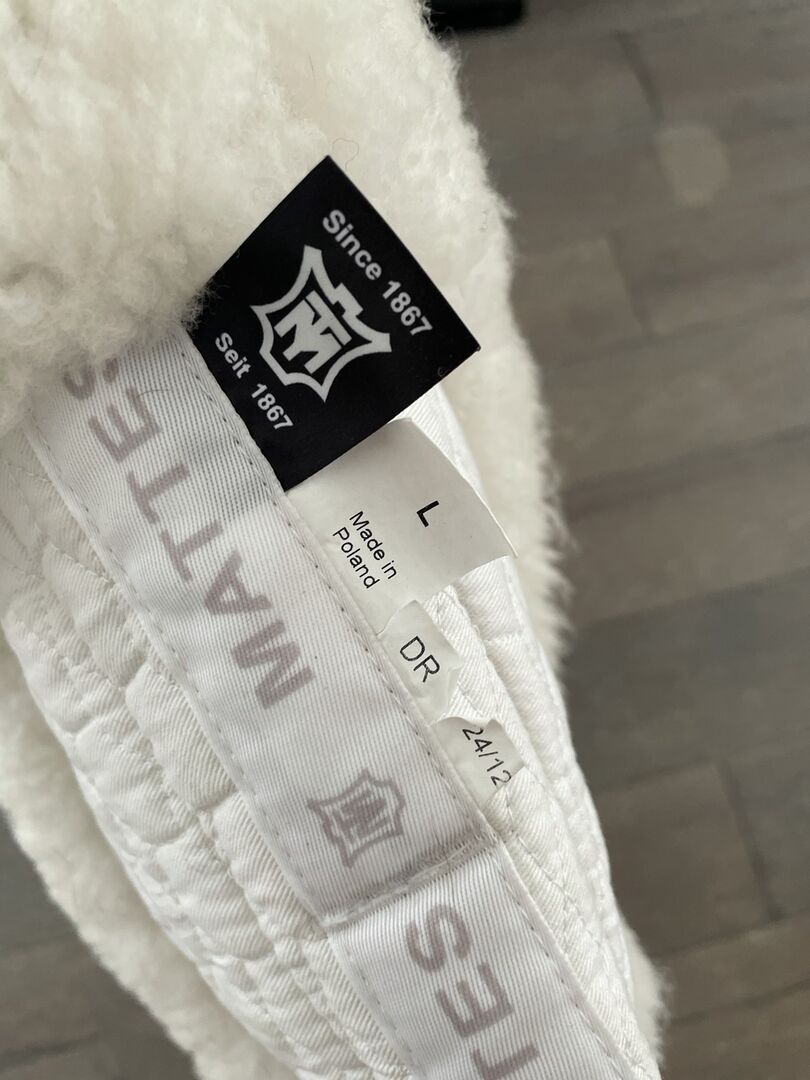Ich verkaufe meine weiße Schabracke von Mattes mit leichten Gebrauchsspuren, die unter dem Sattel nicht stören. Lammfell ist vorne und hinten sowie unter der Schabracke und in einem sehr guten Zustand. Gerne schicke ich weitere Fotos.