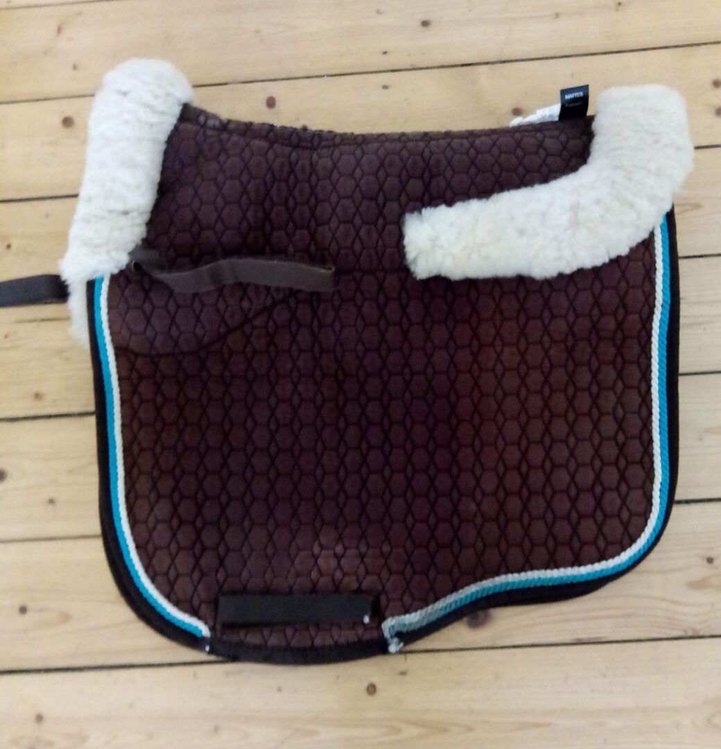 Sehr gut erhaltene und frisch gereinigte Lammfell Schabracke von Mattes abzugeben. Die Schabracke ist in einem sehr guten Zustand, das Lammfell ist super flauschig und wurde immer mit dem dafür vorgesehenen Waschmittel gereinigt. Lediglich im Bereich, wo der Sattelgurt liegt, sind kleine Gebrauchsspuren zu erkennen. Durch die schokobraune Farbe ist die Schabracke schmutzunempfindlich. Die türkise und weiße Kordel wirken dezent-elegant.