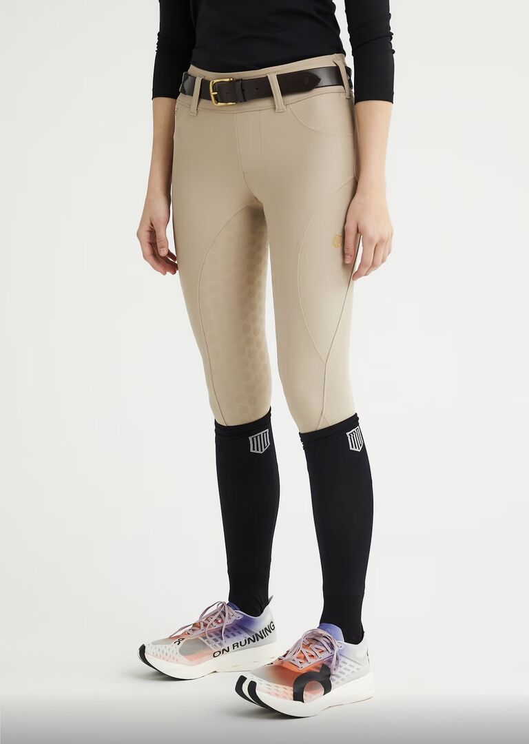 Hellbeige Reithose für Damen, perfekt für Training und Turnier. Aus flexiblem Vier-Wege-Stretch, der für unschlagbare Bewegungsfreiheit und eine perfekte Passform sorgt. Modernes Design mit schicken Details, einer Handytasche und Gürtelschlaufen.