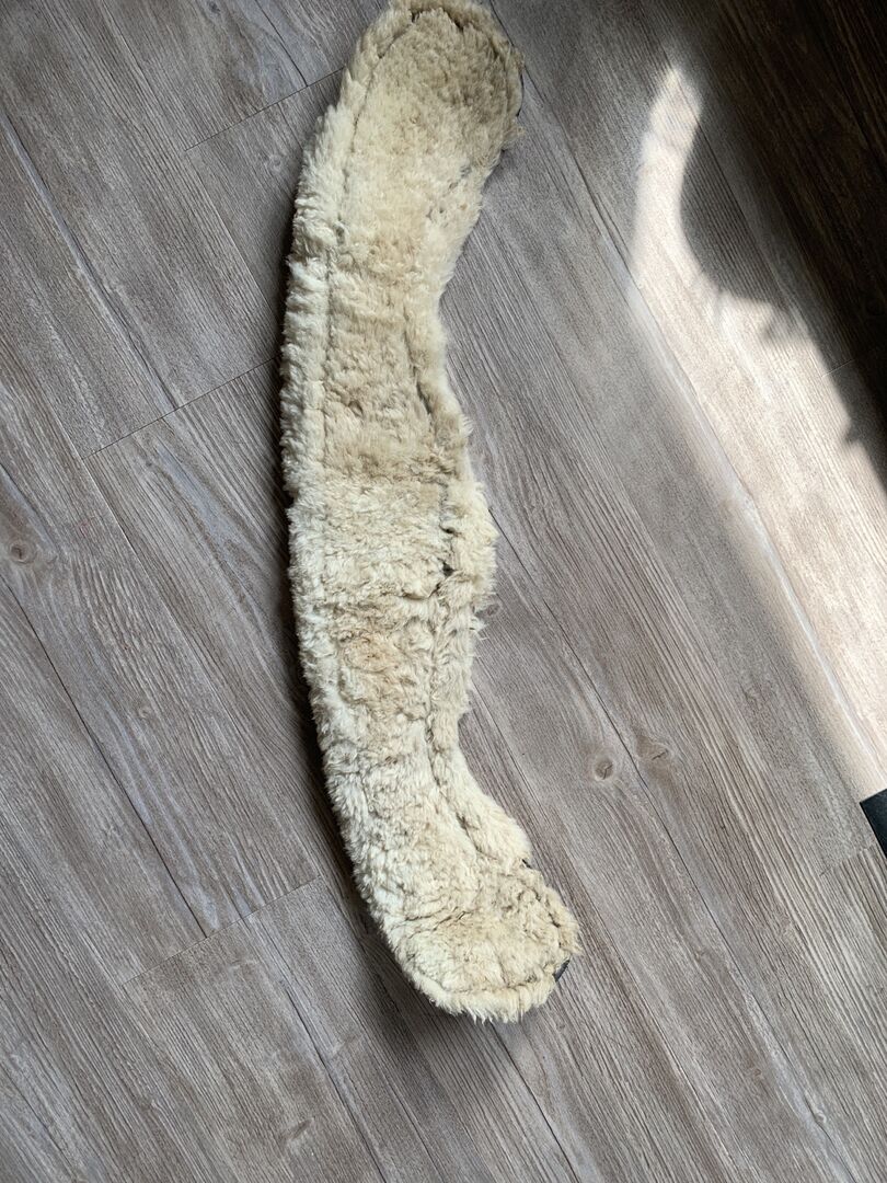 Lammfell-Sattelgurt in Mondform, um bei Pferden mit etwas ausladenderem Bauch einen guten Sitz des Sattels zu gewährleisten. Am Fell kleben noch einige schwarze Haare von meinem Pferd, aber das Lammfell selbst steht noch gut da.