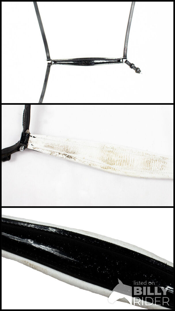 Dieser tolle Hannoveranische Nasenriemen ist ein wahrer Hingucker. Das weiß unterlegte Reithalfter liegt weich auf der Nase des Pferdes auf und ist alleine durch den tollen Farbkontrast ein wahrer Hingucker. Außerdem hat der Riemen schöne Glitzerdetails und Lackoptik, wodurch er schön in der Sonne glänzt. Er hat silberne Beschläge. Er hat Gebrauchsspuren ist aber voll funktionstüchtig. Zum Angebot des Anbieterslaunch