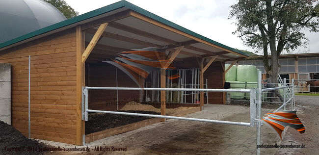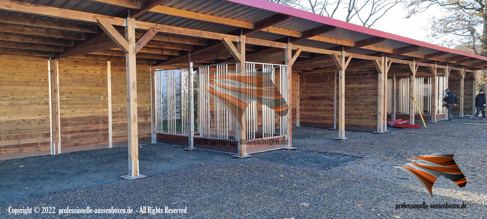 AUSSENBOXEN bietet hochwertige Unterstände und Überdachungen für Pferde, ideal für Weiden, Paddocks und Fütterungsbereiche.