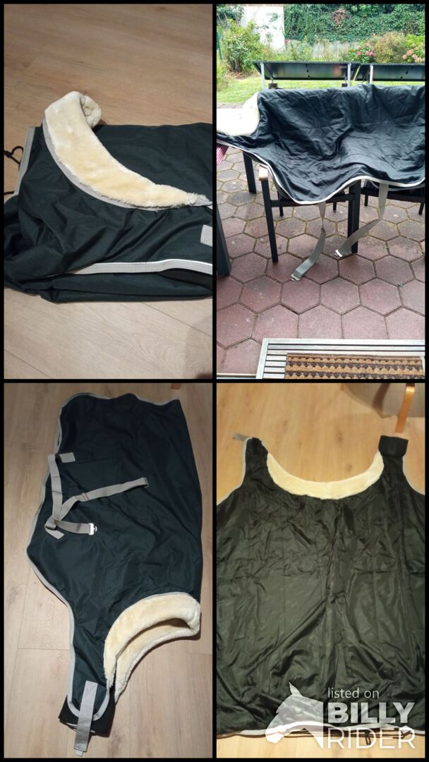 Eine Bewegungsdecke von Felix Bühler in dunkel grün. Die Decke ist wasserdicht und hat eine 100g Füllung, Kreuzgurte und Schweifriemen sowie einen Fellkragen.
