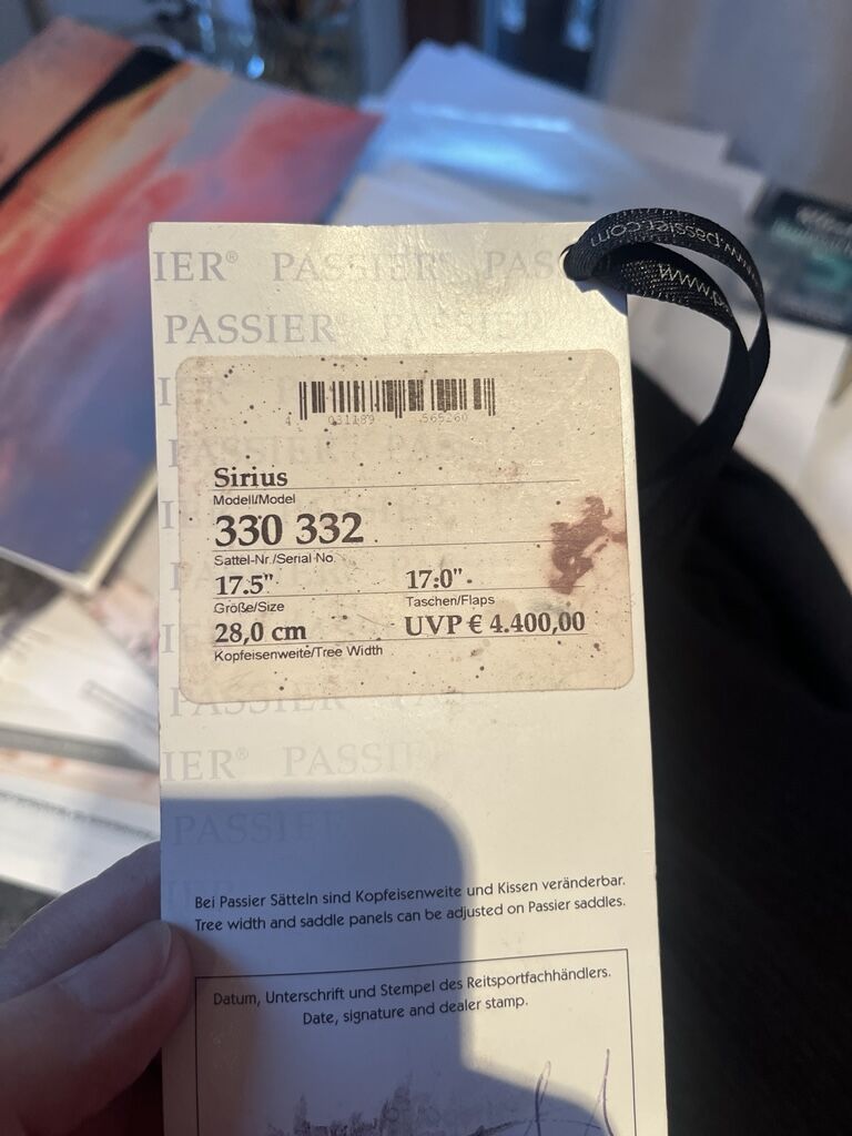 Dressursattel von Passier, Model „Sirius“, super bequem, sportlich, tiefer angenehmer Sitz, Sitzgrösse 17,5 Zoll, Farbe: Havanna braun, Klettpauschen, 2 x 70 cm Sattelstrippen incl V-Begurtung vorne, Sattelblatt Lönge ca 45 cm, keine Applikationen. Kopfeisen 28,0