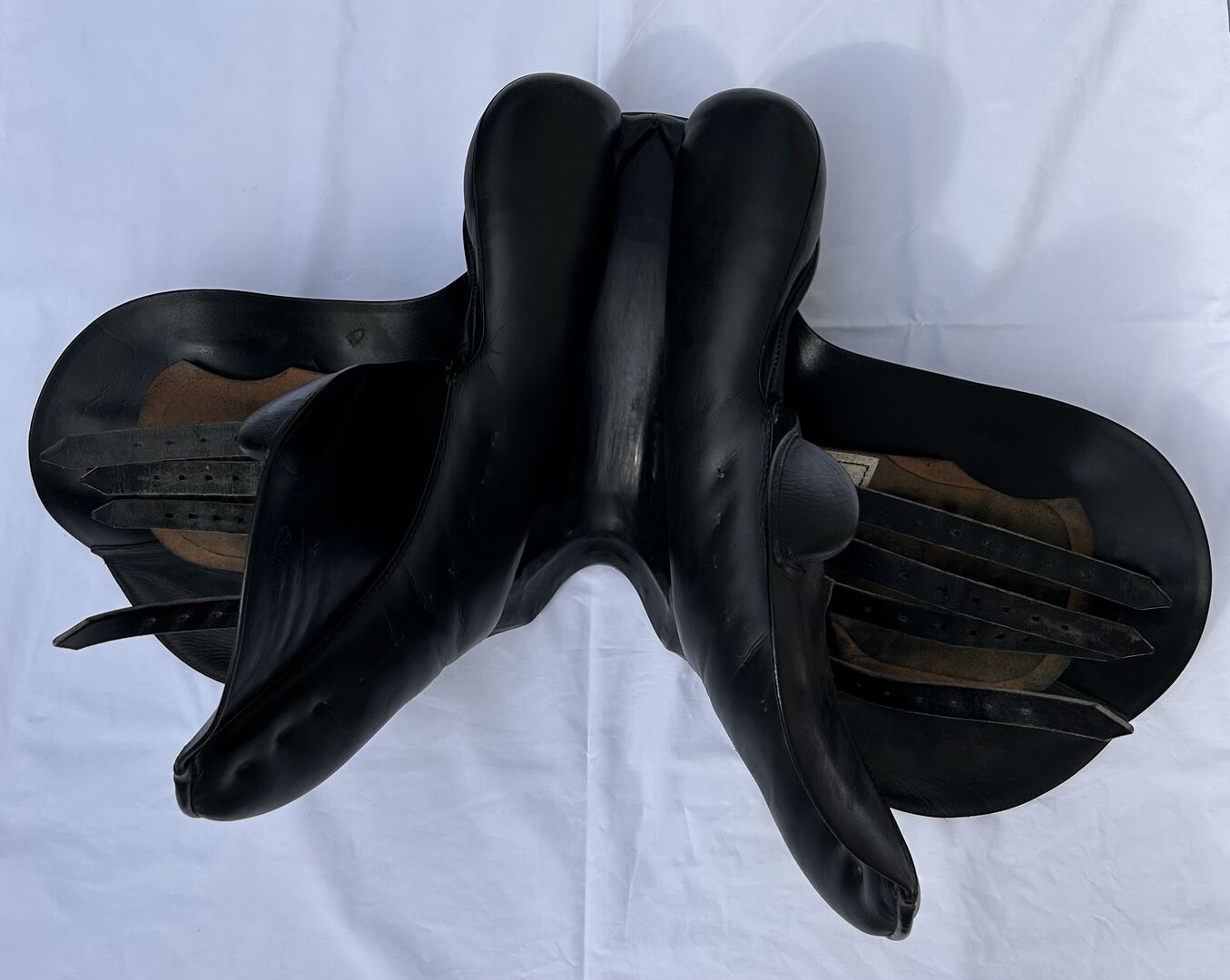 Der schwarze Ledersattel hat einen 17“ Sitz, die Kammerweite von 33 wurde sicherlich verändert, die Kammerweite kann angepasst werden.