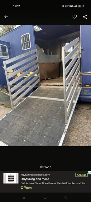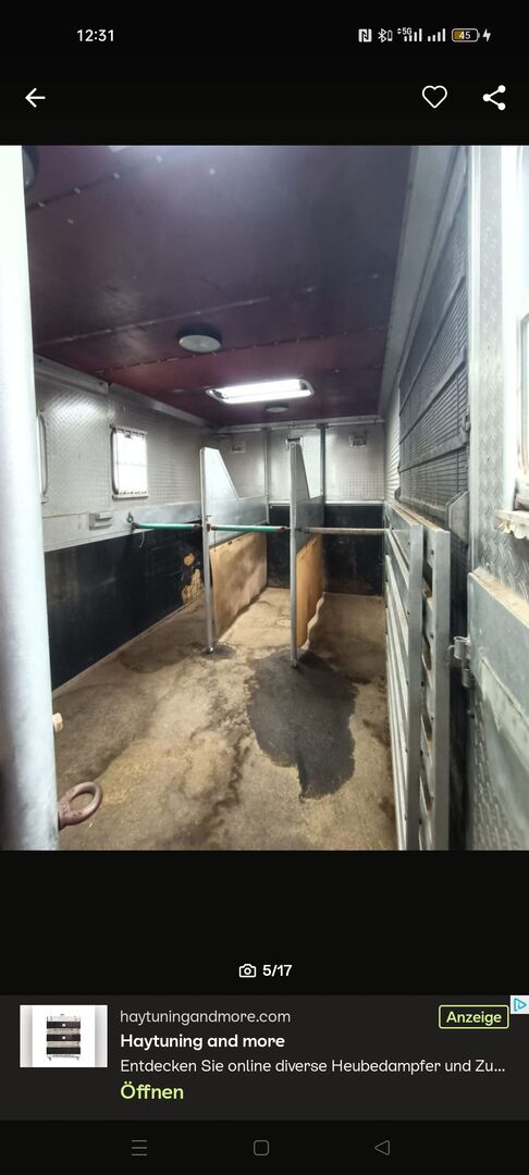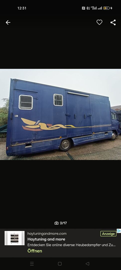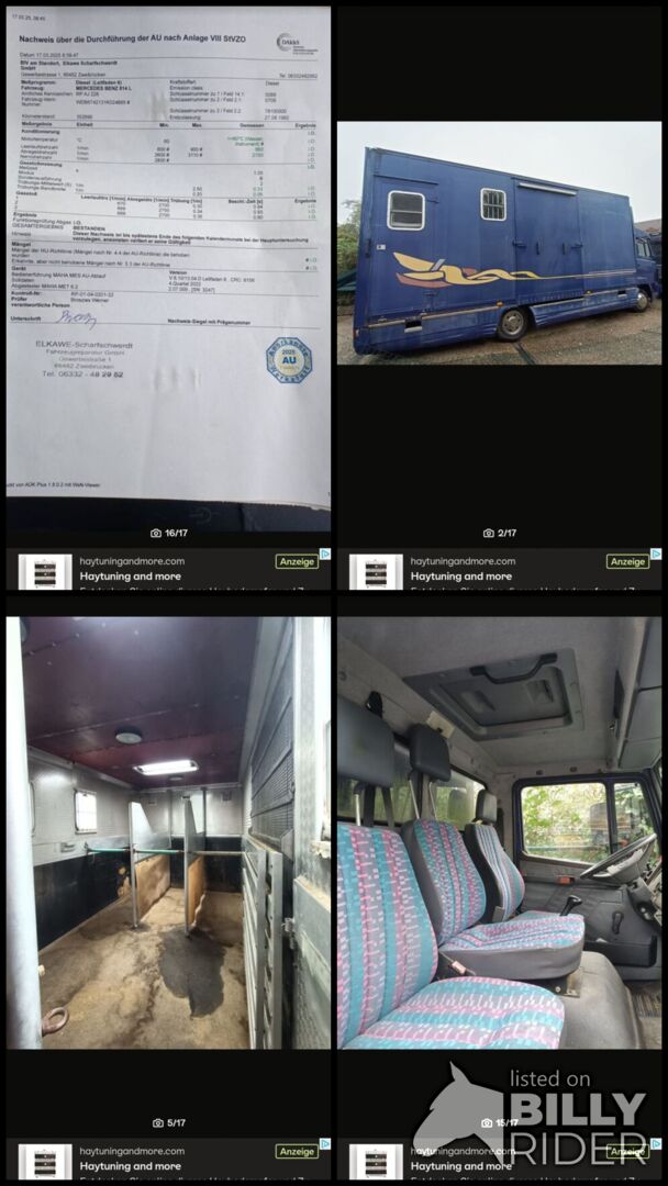 Pferde LKW 7,5t mit Dickenherr Aufbau auf Mercedes Benz 814L, EZ 09-1993, KM Stand 352800 mit Luftfederung, TÜV bis 03/26. Pferdbereich mit 4 Stellplätzen (3 in Fahrtrichtung, 1 quer), Einteilung verstellbar, Kameraüberwachung. Zugang über breite Rampe mit Seitenbegrenzung. Große Sattelkammer mit Zugang von aussen und Zugang zum Pferdebereich. Sattelkammer mit drei Sattelhalter und viel Stauraum. Altersbedingt Rostansatz an der Zierleiste und am Hilfsrahmen (unbedenklich). Kabine mit drei Sitzen und Dachluke, Batteriehauptschalterzur Schonung der Batterien.