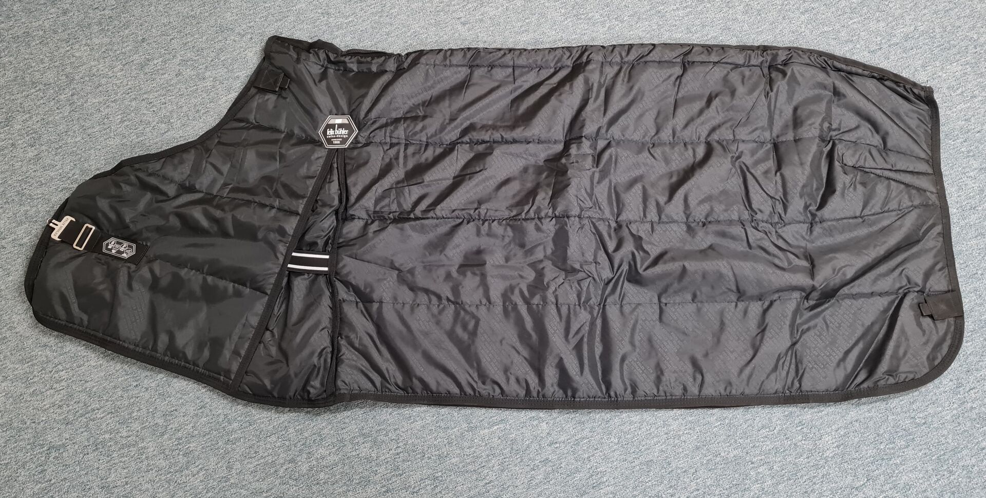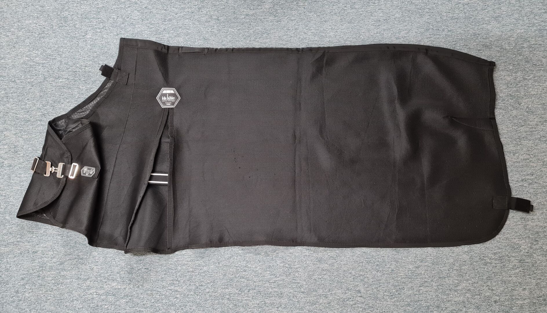 Regendecke (1.200 Denier, Wassersäule 5.000 mm, Atmungsaktivität 4.000 g/m2/24h) mit Liner-System, welches die Befestigung der Unterziehdecken mit Klettverschluss ermöglicht, hohe Gehfalte, Kreuzbegurtung, Schweiflatz, Doppel-Balance-Frontverschluss mit 2 Karabinerhaken und Ring sowie zusätzlichem Klettverschluss; Vorrichtung für Halsteil, Beinschnüre
