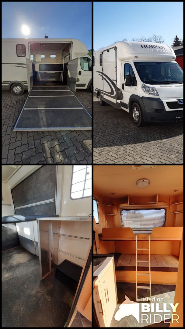 Fahrzeugbeschreibung/ Ausstattung: -EZ.: 04/ 2012 -115KW/ 156 PS -100.362 km laufleistung -Schalter -Diesel (Umweltplakette 4-grün) - HU/AU NEU - Gasprüfung Neu - 1. Hand - Nichtraucher- Fahrzeug - 3- Sitzer, Polsterfarbe Grau, Stoff - ABS/ ESP, Tempomat, Servolenkung - Radio -Zentralverriegelung -Unfallfrei -Zulässiges Gesamtgewicht: 4.250 kg Leermasse: 2.800kg -Anhängerkupplung starr (2.000kg Anhängelast) -Außenlänge : 7,17 m -Außenbreite: 2,14 m -Außenhöhe: 2,94 m -Große Verladerampe Beifahrerseite -Trennwand mit Schnellsteck-System individuell anpassbar -Licht und Lüfter im Pferdeladeraum seperat zuschaltbar -Sattelfächer mit Licht für Sättel, Trensen und Zubehör -Zusätzlicher Stauraum im Alkoven -Anbindevorrichtung für Pferde und Heunetze im Pferdeladeraum -Wohnkabine mit extra Aufbautür und manueller Trittstufe -Extra Aufbaubatterie für Wohnkabine -Gaskasten für 1 Gasflaschen -Sofa umbaubar zum Etagenbett (2 Schlafplätze) -Bettmaße 2 x 210cm x 65 cm -Klapptisch -3- Flammen-Kocher -Spülbecken -Frischwassertank 25 l -Abwassertank 25 l rollbar -WC- Porta Potti -Großer Kleiderschrank -Zusätzlicher Stauraum durch Oberschränke -Zulassungsdokumente