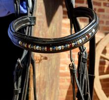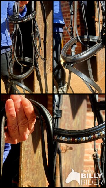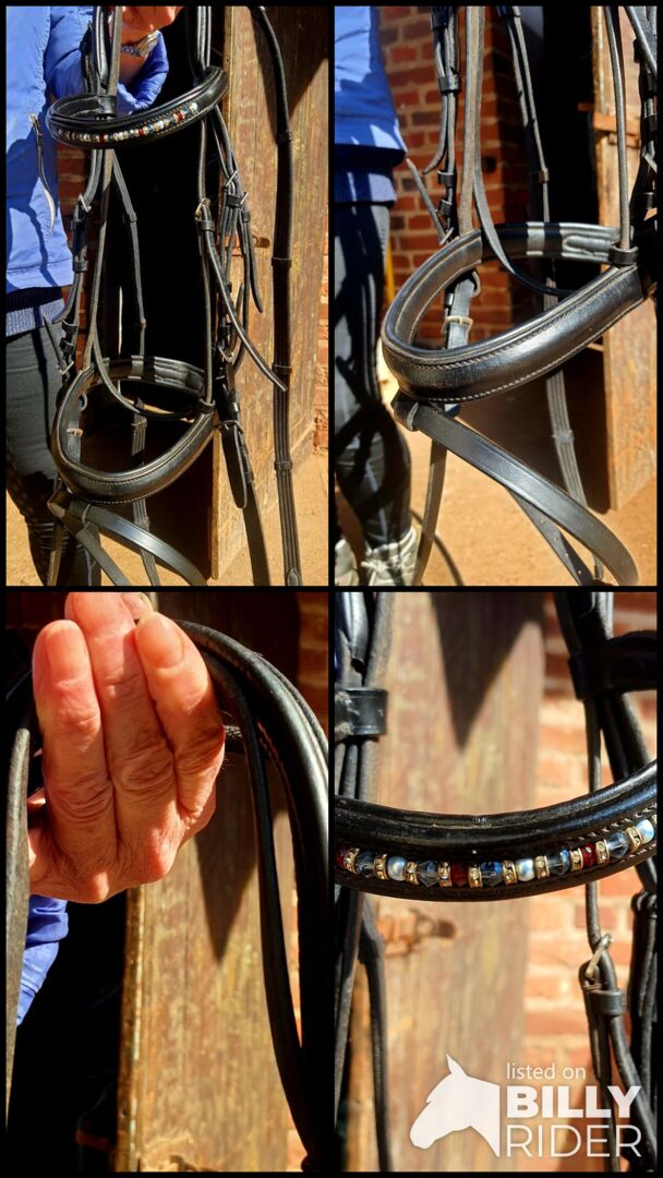 Details: • Größe: Vollblut • Farbe: Schwarz • Mit Strass-Stirnriemen • Sehr weich gepolstert • Inkl. Zügel