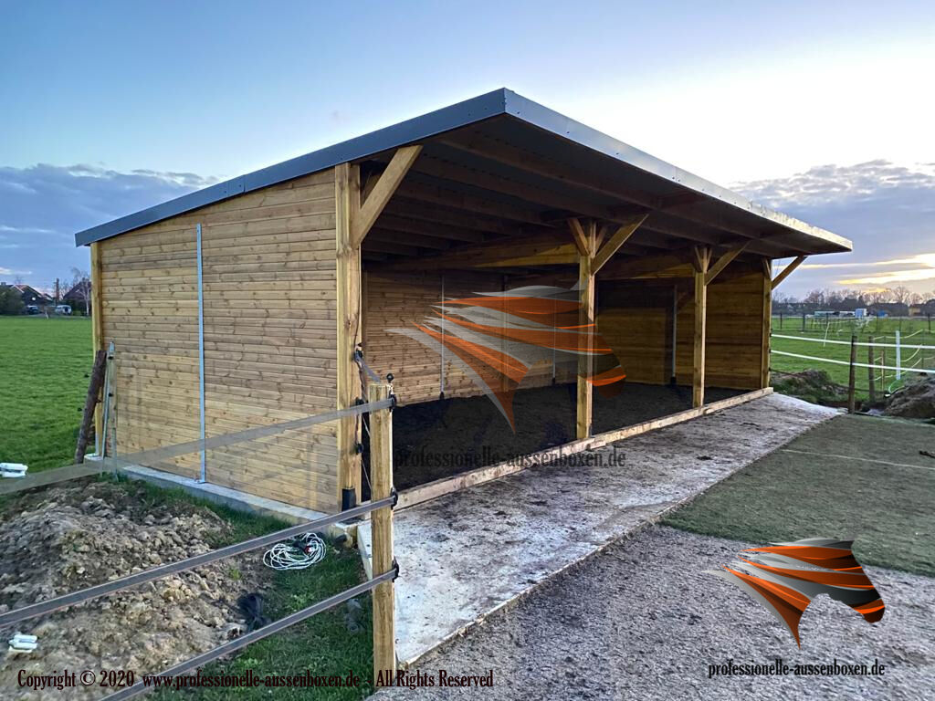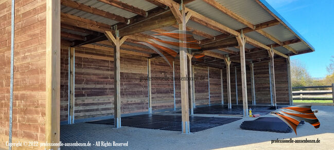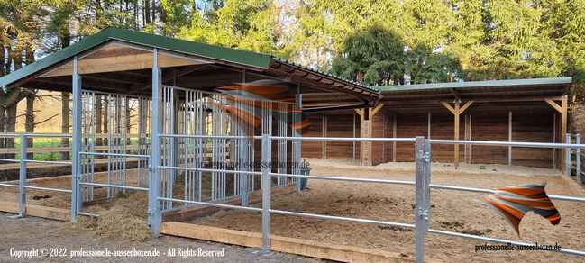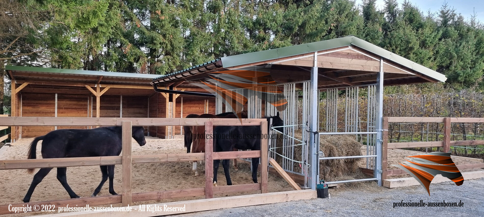 AUSSENBOXEN bietet hochwertige Unterstände und Überdachungen für Pferde, ideal für Weiden, Paddocks und Fütterungsbereiche.