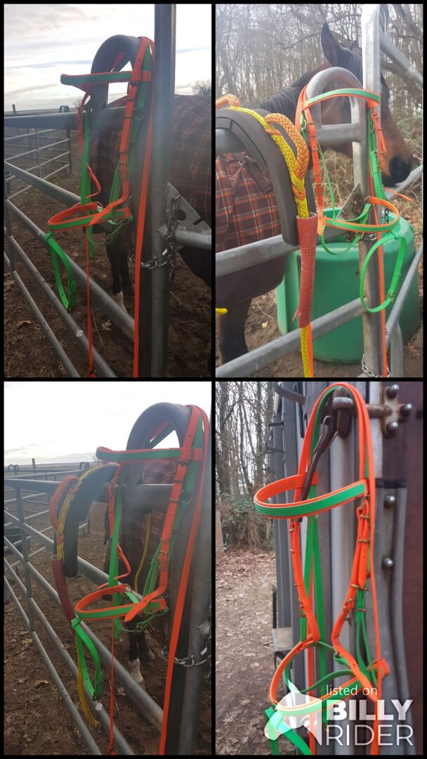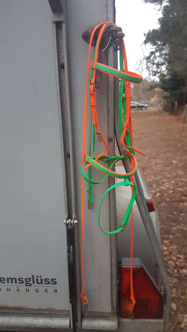 Orange-grüne Trense (kombiniertes Reithalfter) mit orangen Zügeln von Tajara Horsewear. Mega praktisch da wetterfest und leicht zu reinigen (in Waschmaschine oder Geschirrspüler) NP ca. 170€