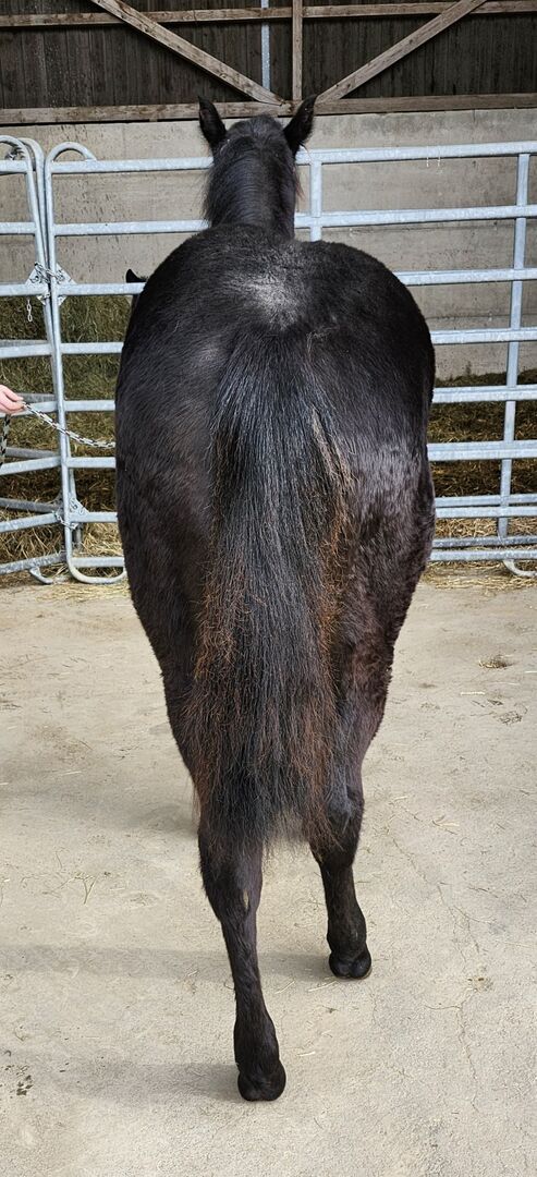 Drifts To The Future ist ein bildhübscher American Quarter Horse Hengstjährling, geboren am 05.06.2025. Er ist schwarz (black) mit nur wenigen Stichelhaaren an der Stirn und genetisch homozygot black sowie homozygot agouti. Die AQHA-Papiere sind beantragt, das zu erwartende Endmaß liegt bei ca. 162 cm. Der junge Hengst überzeugt durch ein korrektes Gebäude, eine sehr gute Entwicklung, ausgewogene Bemuskelung und starke Knochen. Midnight wird später auch größere Reiter problemlos abdecken können. Seine Grundgangarten sind gut und taktsicher, er lernt schnell und bringt ein ausgeglichenes, angenehmes Temperament mit. Charakterlich ist Midnight ein echtes Goldstück. Er ist sehr menschenbezogen, stets freundlich, ruhig und gelassen und meist der Erste, der einen am Weidetor begrüßt. Er möchte gefallen, ist sehr brav im Umgang und zeigt sich jederzeit kooperativ. Er wächst im Herdenverband auf, kennt das Fohlen-1x1, ist halfterführig und kennt sowohl Tierarzt als auch Hufschmied. Er ist gesund, regelmäßig entwurmt und 6-Panel n/n getestet. Abstammungsmäßig ist er etwas ganz Besonderes: Er ist der einzige Sohn von Drifts Chip in Europa und stammt aus der berühmten 6666 Ranch-Blutlinie, die weltweit für Vielseitigkeit, Leistungsbereitschaft und Rittigkeit bekannt ist. Damit ist er nicht nur für Freizeit und Turniersport, sondern auch für die Zucht hochinteressant. Ob als zukünftiges Showpferd, Sportpartner oder zuverlässiger Freizeitbegleiter - mit seinem Potenzial für verschiedene Disziplinen und seinem außergewöhnlich lieben Charakter ist Drifts To The Future ein echtes Versprechen für die Zukunft.