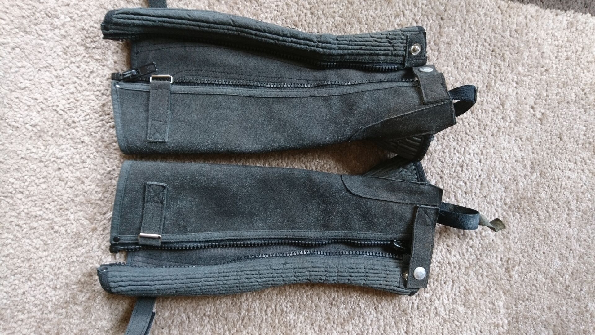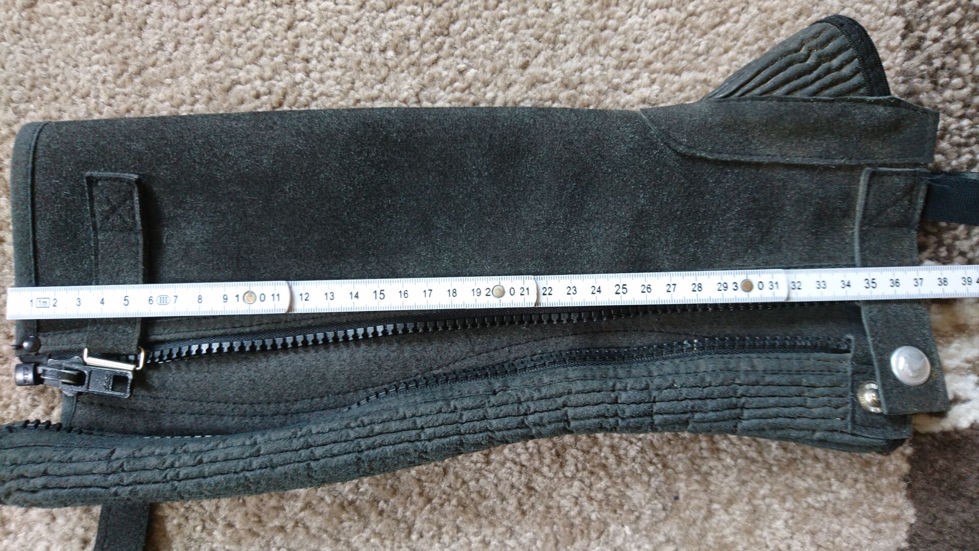 Leider müssen wir schweren Herzens und aus gesundheitlichen Gründen unser Hobby aufgeben. Daher bieten wir hier Kinder Chaps - Gamaschen (CL) an. Sind aus robustem Kunstleder gefertigt. Die anatomische Passform sorgt für einen angenehmen Sitz am Bein. Reißverschlüsse, Klettverschlüsse und Druckknöpfe sind einwandfrei. Die Chaps sind nur leider etwas verblasst und sind nun grau-schwarz. Es sind keine Löcher, Flecken oder andere Beschädigung vorhanden.