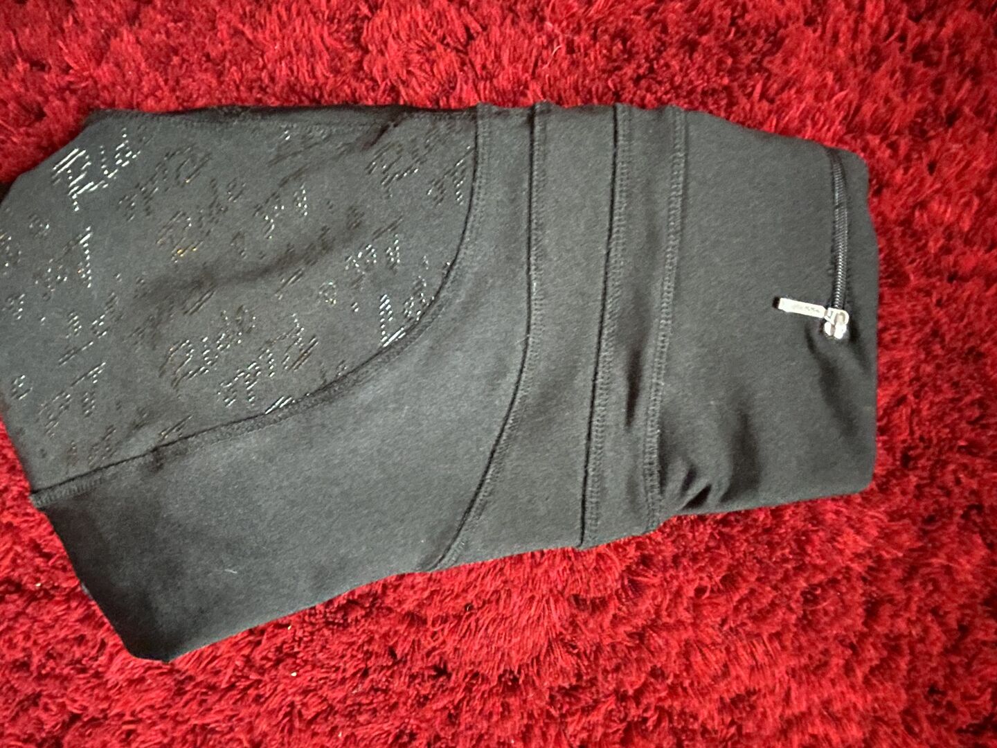 Die Reitleggins hat die Farbe schwarz und ist gerippt. Sie hat zwei kleine Taschen, die man mit einem Reißverschluss zu machen kann. Sie fällt kleiner aus. Größe: 36 (ich trage eigentlich 34) Sie wurde bis jetzt nur eine Woche im Reiturlaub getragen. Größe