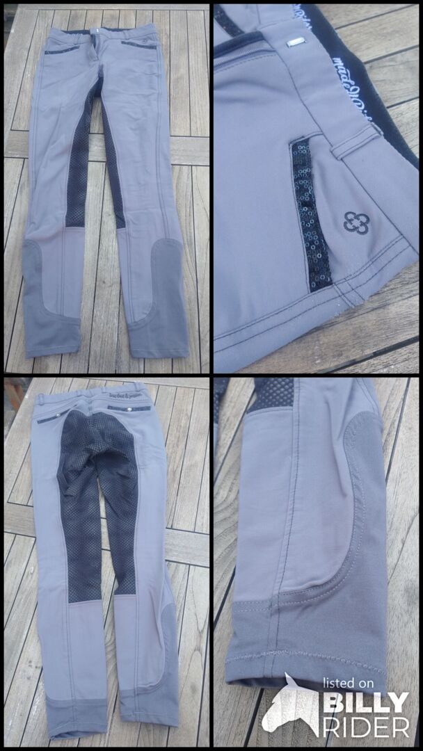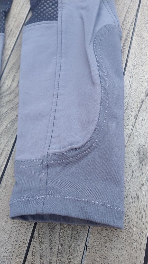 Reitleggins grau aus Softshell mit Grip-Vollbesatz in schwarz, schmal geschnitten. Größe 170 / 176. Vorne zwei kleine Taschen