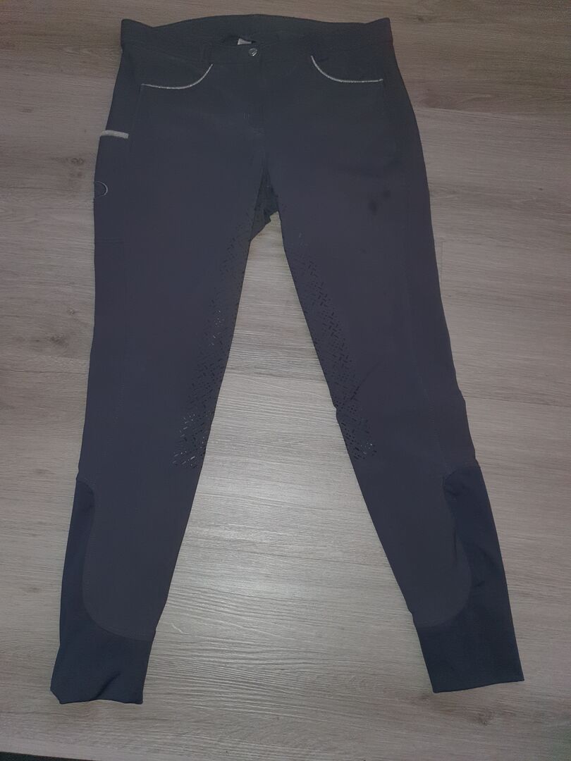 Verkaufe Silikonvollbesatzreithose Silver Design Riderschoice für Damen, Größe 44, Farbe Grau, Grip ist vorhanden und nicht abgenutzt.