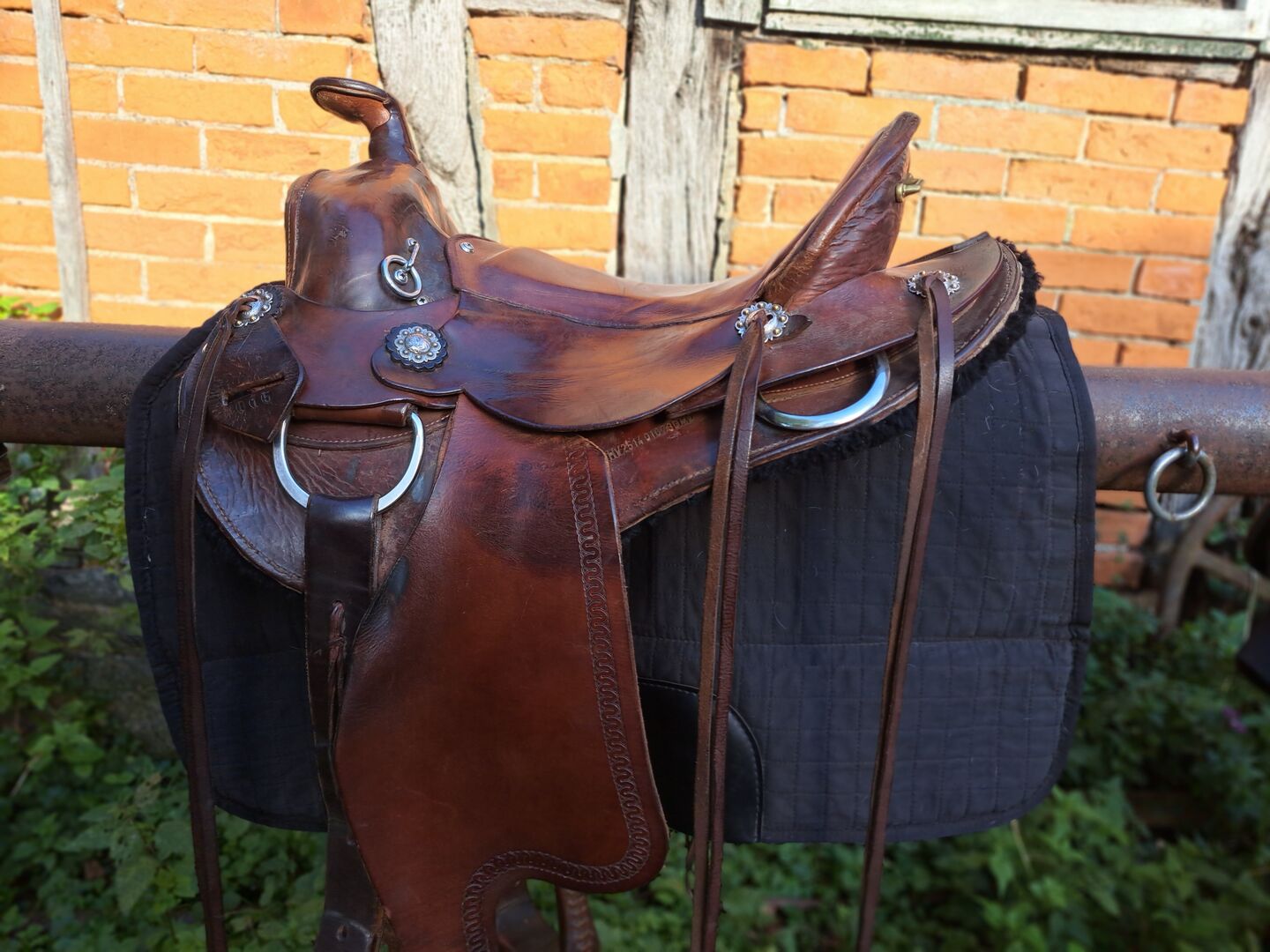 Es ist ursprünglich ein Deuber Westernsattel, welcher bei Rieser überarbeitet wurde und einen neuen Holzsattelbaum bekommen hat. Er hat dadurch ein paar Falten, weil das Leder ebend nicht perfekt an den neuen Baum gepasst hat, was seine Funktion jedoch nicht einschränkt und ihn zu einem einzigartigen exemplar macht. ;-)