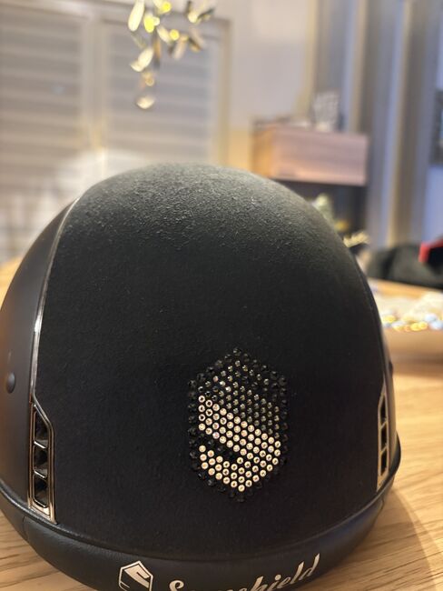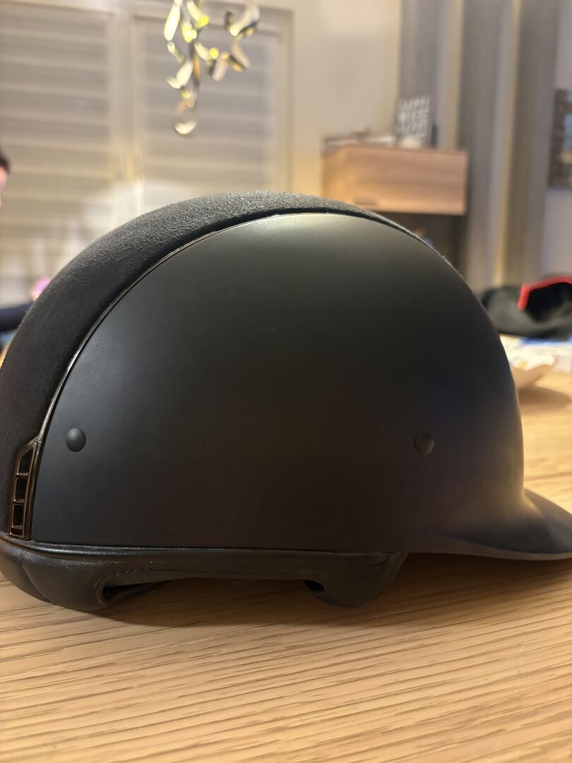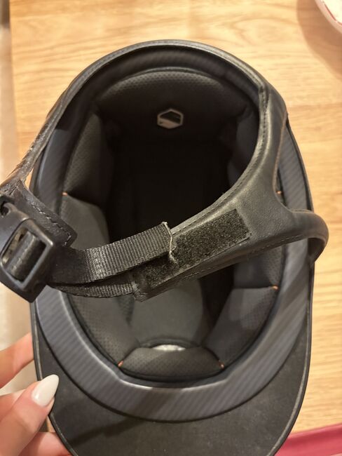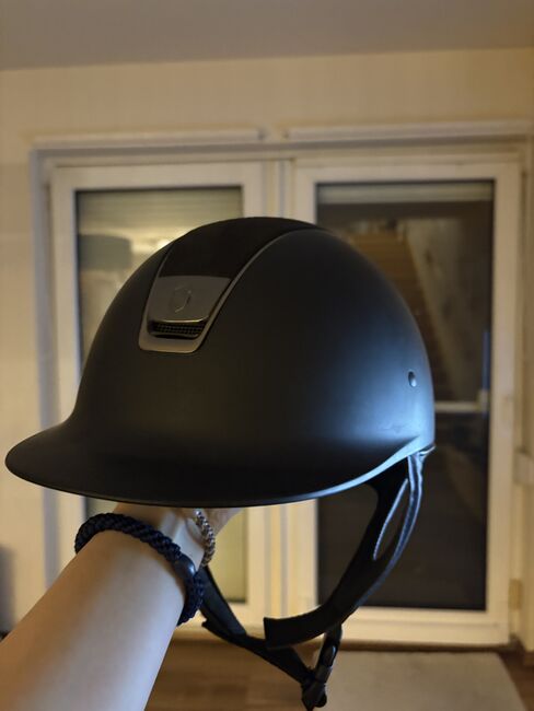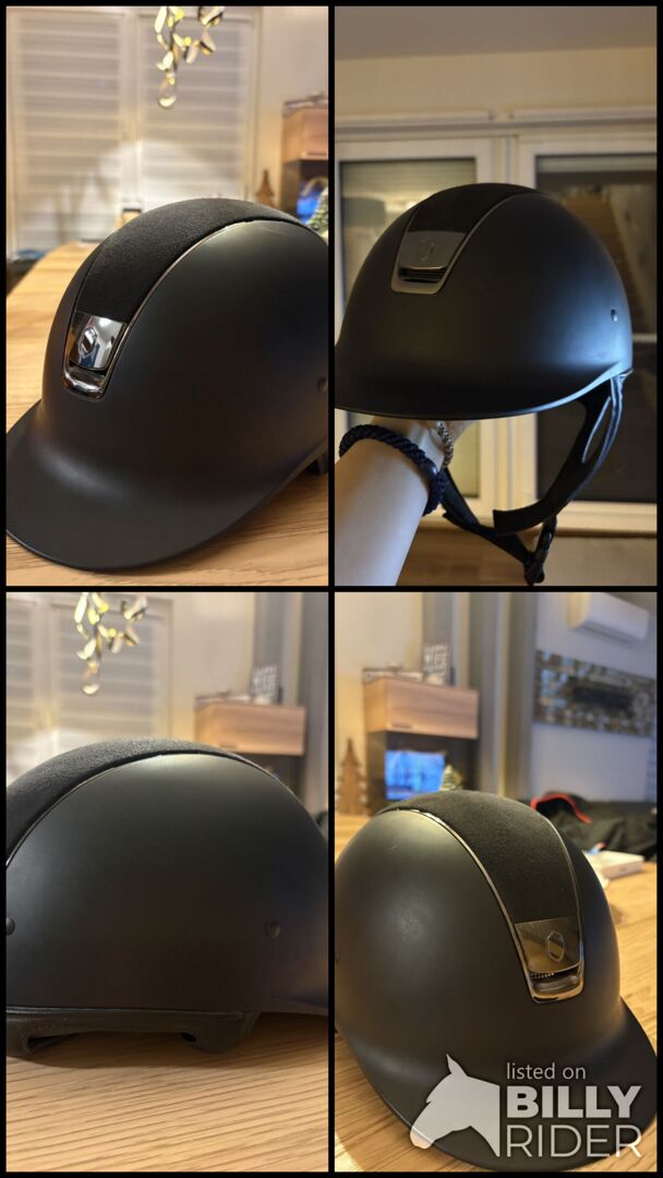 Farbe ist matt schwarz Habe ihn nur am Turnier getragen Er ist sturzfrei Metall Farbe ist chrome Oben Alcantara mit einem Swarovski S auf der Rückseite Inlay ist Größe 54 Keine Kratzer