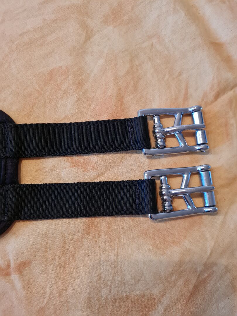 Sattelgurt Textil mit Geleinlagen, schwarz, Marke Hippopren comfort by Loesdau, wenig benutzt, und auch nur mit Echt-Schaffellüberzug (daher die weißen Pupsel auf dem Gurt, das ist vom Leder des Schaffells), 130 cm