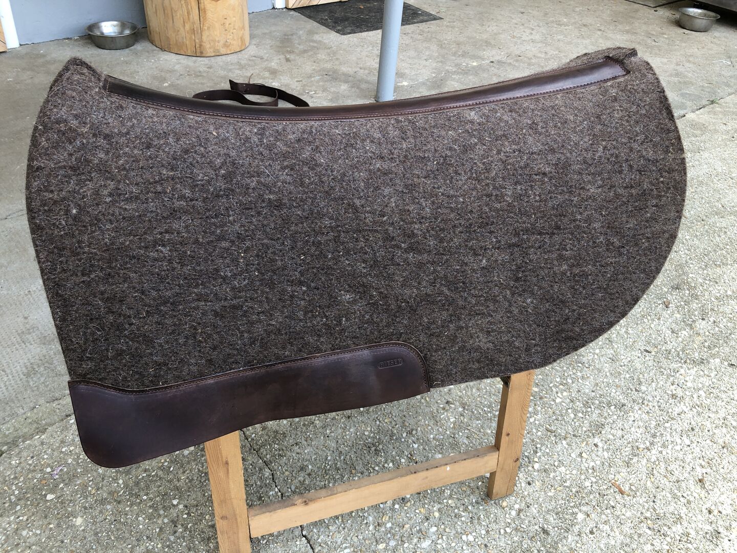 Anatomisch geformtes Pad aus naturfarbener, unbehandelter Schafswolle mit Mittelnaht, im Widerrist zurückgeschnitten, und Lederbesatz in braun Länge 78 cm, Stärke 20 mm.