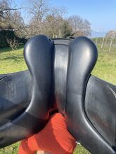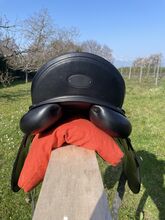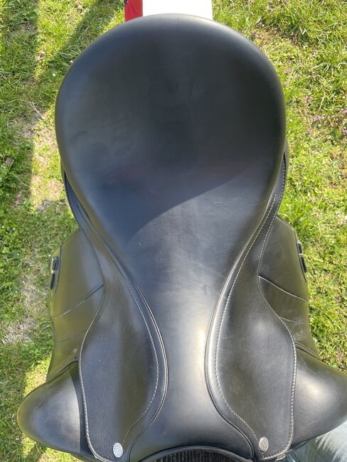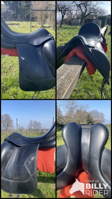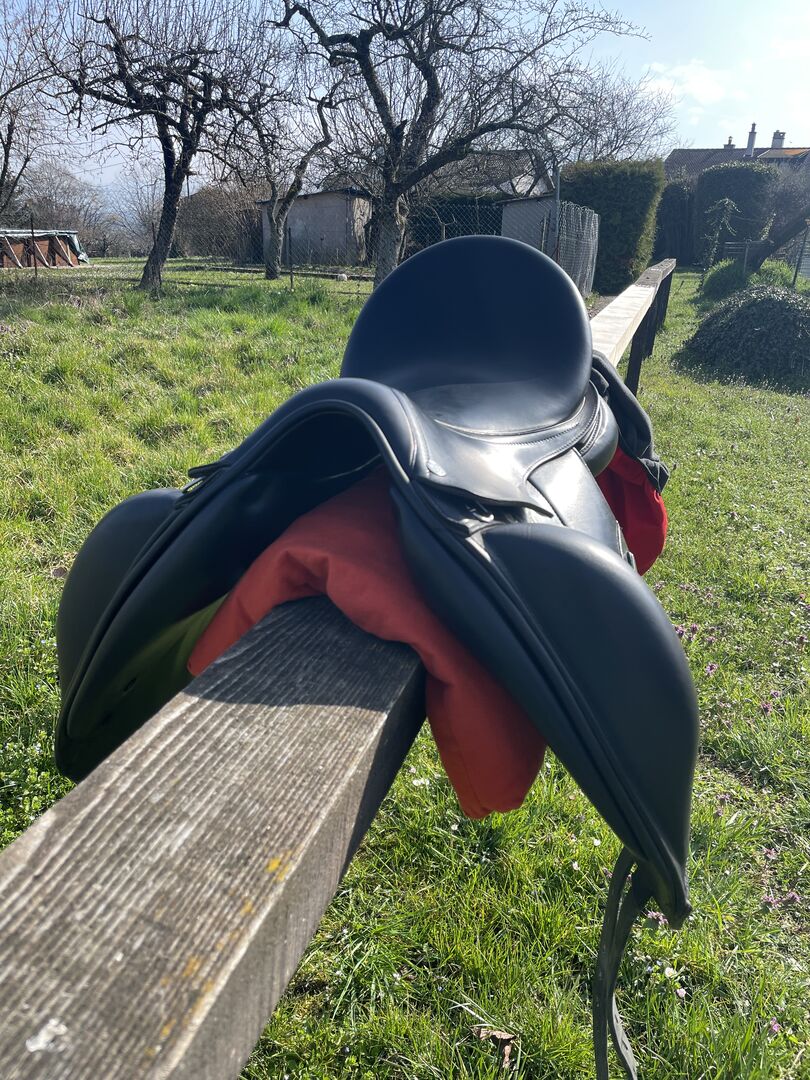 Tiefer, hohler Sitz. Größe 17,5 ecarbon-Sattelbaum. Sattelblätter M, Sattelbaumöffnung +1 (für Pferde mit normalem Widerrist und eher kräftig gebauten Schultern). Spezielles schwarzes Leder.