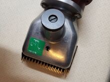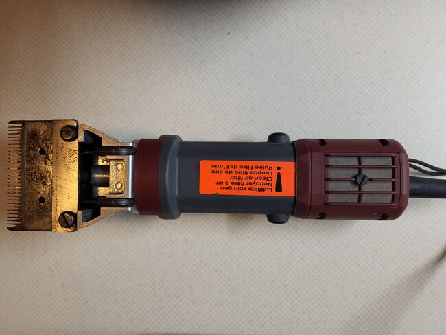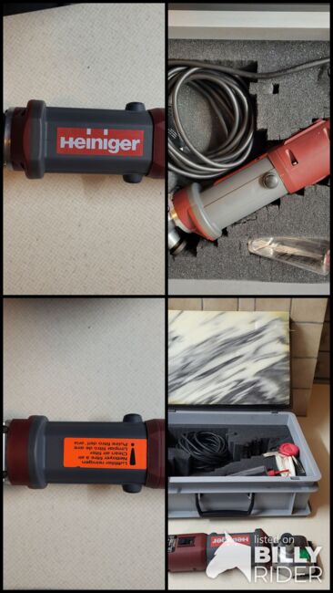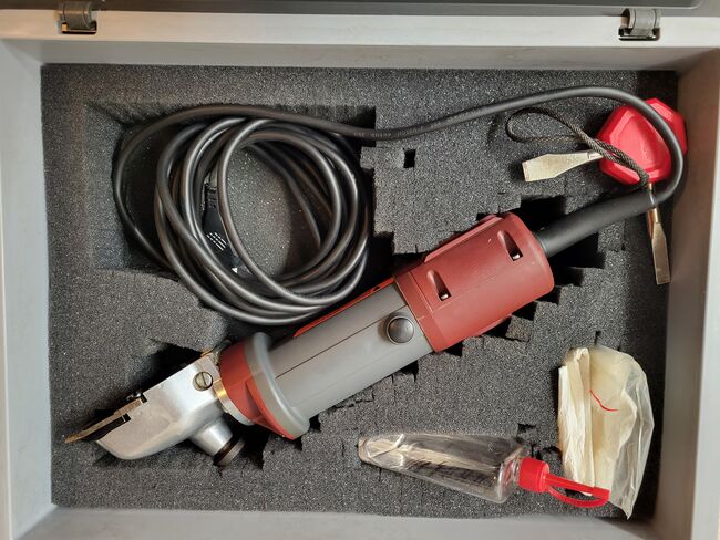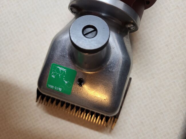 Die Maschine wurde wenig gebraucht und gut gepflegt. Insgesamt hat sie 3 Messeraufsätze. Am Scherkopf hat sie einen kleinen Mackel. Dieser wurde aber von Heiniger abgeklärt und hat keinen negativen Einfluss auf die Maschine.