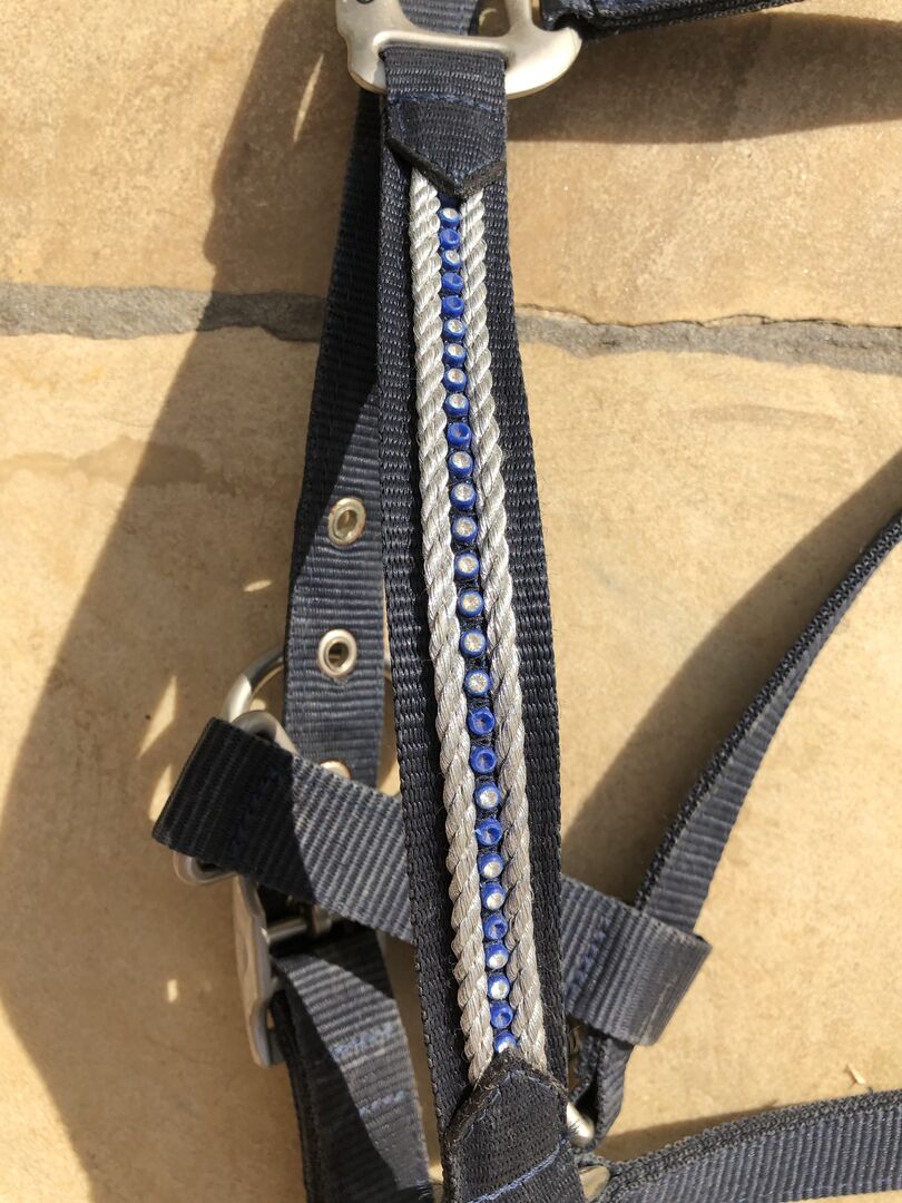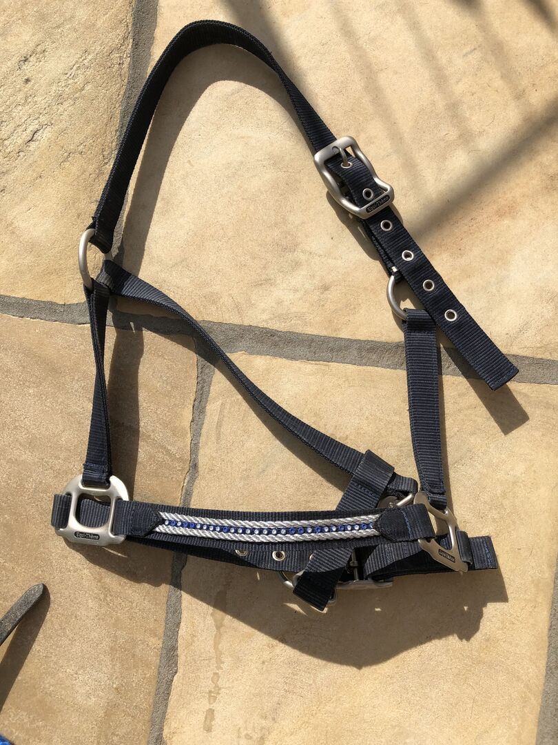 an, leider hat es am Nasenstück die Glitzersteine teilweise verloren. Es kann in Größe pony und cob eingestellt werden.