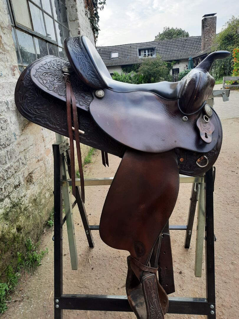 Dieser sehr schön punzierte, Tax Tan Herford Brand yoakum ist meinem Jungpferd leider zu eng geworden, wird somit nicht mehr genutzt und steht deshalb zum Verkauf. Maße bitte den Bildern entnehmen. Sattel wurde für ein schmales Quarter Horse zum anreiten benutzt. Für Pferde mit schmaler Schulter und kurzem Rücken geeignet.