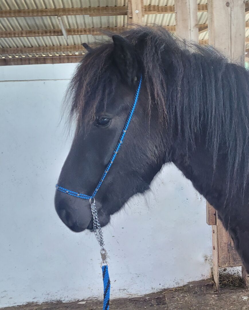 Halfter Jährling blau/schwarz ,komplett mit Kette und Strick. Das Halfter ist dezent, mit vielen kleinen Ornament-Perlen verziert. In jede Seite und auf der Nase sind silberne Perlen eingearbeitet. Das Halfter und der Vorführstrick sind zweifarbig gefertigt.